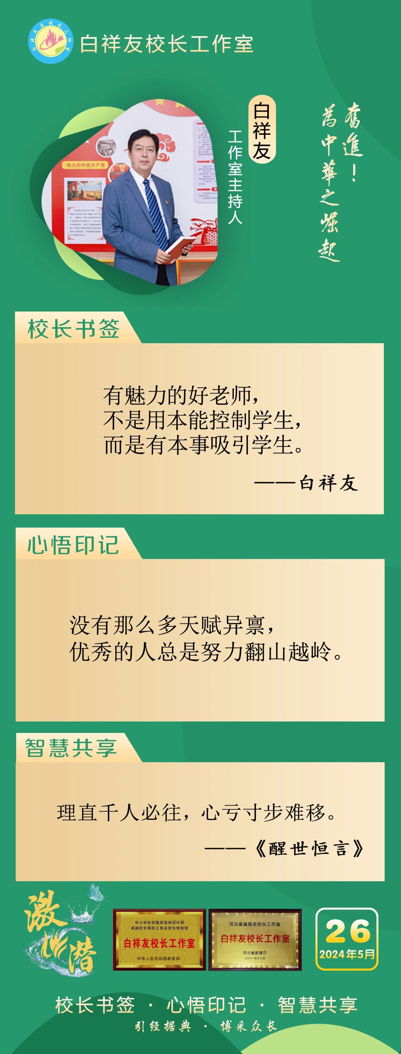 “白祥友校長工作室”成立于2019年4月,是教育部“國培計劃”中小學名校長領航工程、河北省首批名校長工作室,目前省內外成員校20個。工作室堅持“資源共享、智慧共融、互助共贏”理念,已成為思想碰撞的交流場,資源共享的品牌站,成果展示的輻射源。