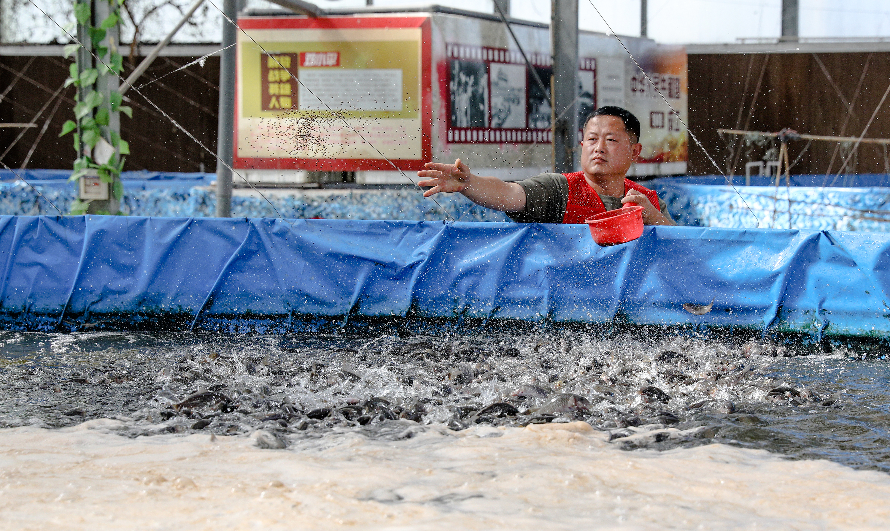 “‘魚菜共生’是一種新型復合耕作體系。”張建輝指著魚池和蔬菜池之間縱橫交錯的管道介紹,通過這些管道,他們將魚池和蔬菜池連接成一套種養循環系統,魚池的水24小時循環流入蔬菜池,魚的糞便和餌料經過二次過濾后進入蔬菜池為蔬菜“施肥”,這些蔬菜在吸收肥料養分的同時將魚池的水凈化,再循環流入魚池給魚用,真正實現了“養魚不換水,種菜不施肥”。