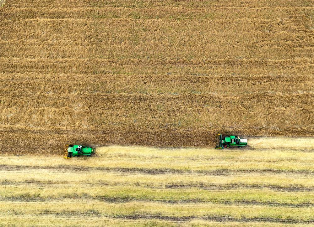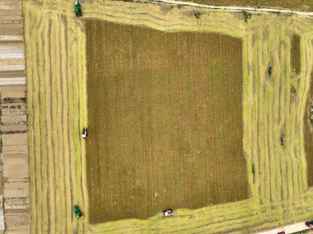 ↑5月24日,在棗強(qiáng)縣恩察鎮(zhèn)的油菜種植基地,聯(lián)合收割機(jī)在收割油菜(無人機(jī)照片)。
