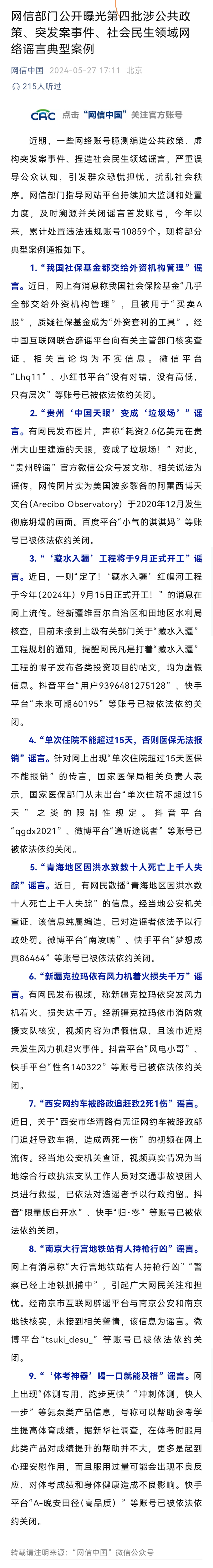 關注:網信部門公開曝光第四批涉公共政策、突發案事件、社會民生領域網絡謠言典型案例