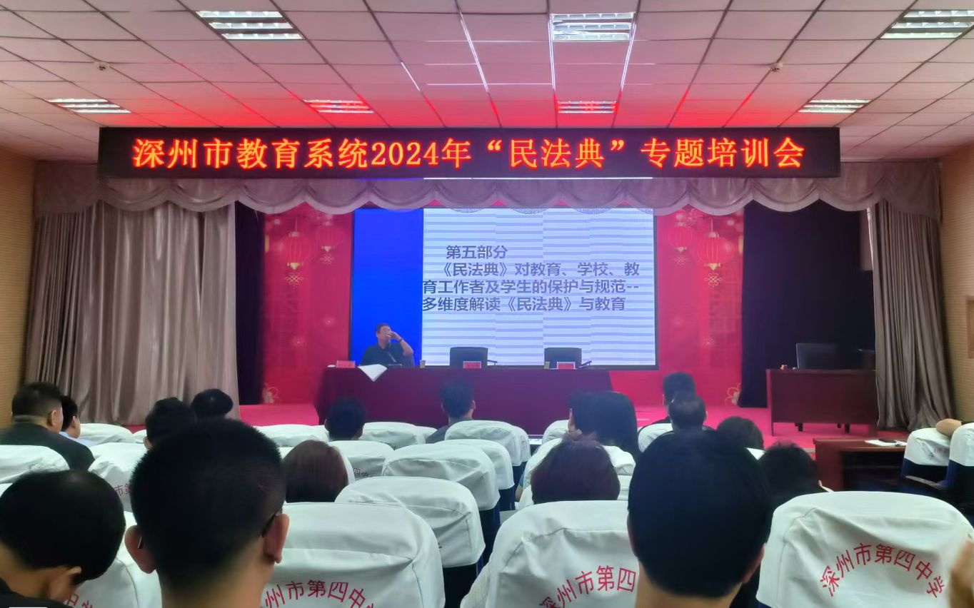 為深入貫徹落實習近平法治思想,推動民法典進校園活動,深化師生對民法典的理解與運用,深州市教育局于2024年5月24日下午3點在深州市第四中學成功舉辦了“堅持習近平法治思想 深化民法典宣傳貫徹”培訓班。此次培訓班恰逢我國第四個“民法典宣傳月”,旨在通過專業的法律培訓和實際案例分析,增強教育系統師生的民法典意識。