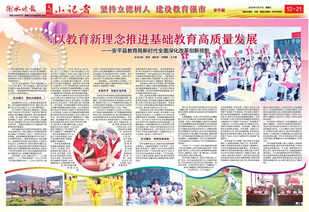 安平縣教育局凝心聚力從整體上提高基礎教育的質量,維護良好的教育環境,讓教育改革的成果惠及每一個兒童。教育局相關負責人表示,面向中國式現代化,我國基礎教育責任重大。作為國民教育體系中的組成部分,安平縣教育局將以高質量的基礎教育培養學生探索性、創新型的優秀思維品質,帶動縣域教育赴高效征程,助力做大衡水市人才“蓄水池”。