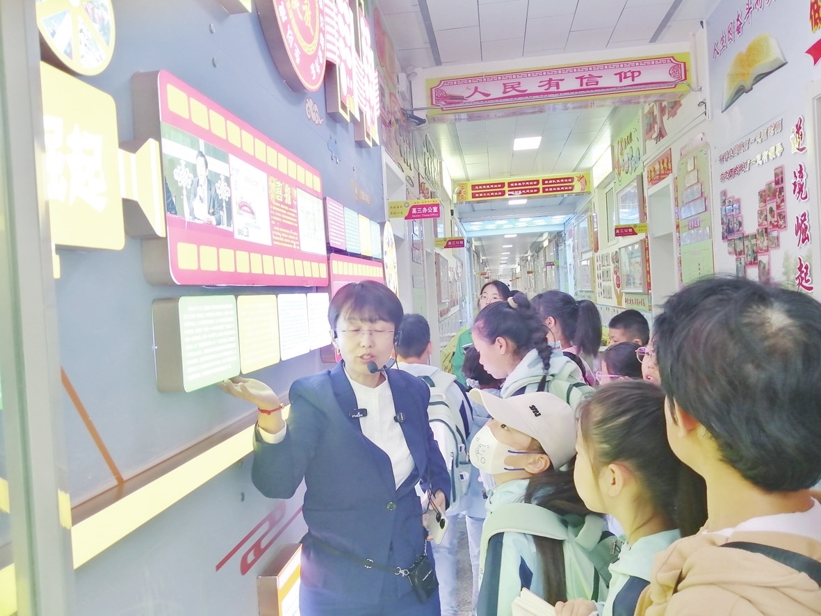 豐富多彩的校園文化,處處彰顯著十三中的獨特魅力,也帶給了小記者們潛移默化的正向引導。在“科技文化墻”,聆聽著一個個奇思妙想的故事,大家在筆記本上認真寫下“南仁東”“FAST”等既陌生又熟悉的字眼;在“夢想廳”,大家聚精會神地聽老師講述關于學習、未來的故事,在心中描繪出屬于自己的夢想;在“拾金不昧”角,講解老師的話音剛落,就有小記者連連表示自己要做一個拾金不昧的好孩子。