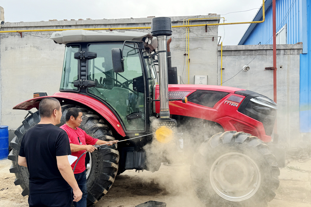 桃城區(qū)農(nóng)業(yè)農(nóng)村局工作人員(左)指導(dǎo)農(nóng)機手清理發(fā)動機空氣濾芯。王政 攝