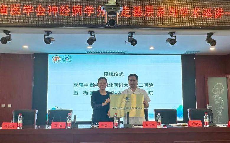授牌儀式上,河北省醫科大學第二醫院李震中教授向武邑縣醫院授予“協同創新網絡成員單位”牌匾。 河北省醫科大學第二醫院董梅教授向該院授予“神經系統疾病??坡撁顺蓡T單位”牌匾。