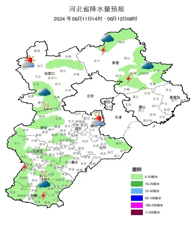 具體天氣預報為:6月11日傍晚到夜間,陰有分散性雷陣雨或陣雨轉晴,偏南風3~4級,最低氣溫24~25℃;6月12日,晴間多云,偏南風3~4級,氣溫41~26℃;6月13日,晴轉多云,偏南風4級左右,氣溫42~30℃;6月14日,多云間陰有雷陣雨,東北風3~4級,陣風5~6級,氣溫35~23℃;6月15日,多云轉晴,氣溫35~23℃。