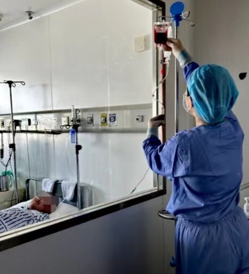 造血干細(xì)胞經(jīng)解凍、復(fù)溫,再通過(guò)輸血器一滴一滴地流進(jìn)患者體內(nèi)。在這個(gè)過(guò)程中,患者配合進(jìn)行著深呼吸,以便盡快排出干細(xì)胞冷凍液中的二甲基亞砜。6袋造血干細(xì)胞,分兩次順利輸完。