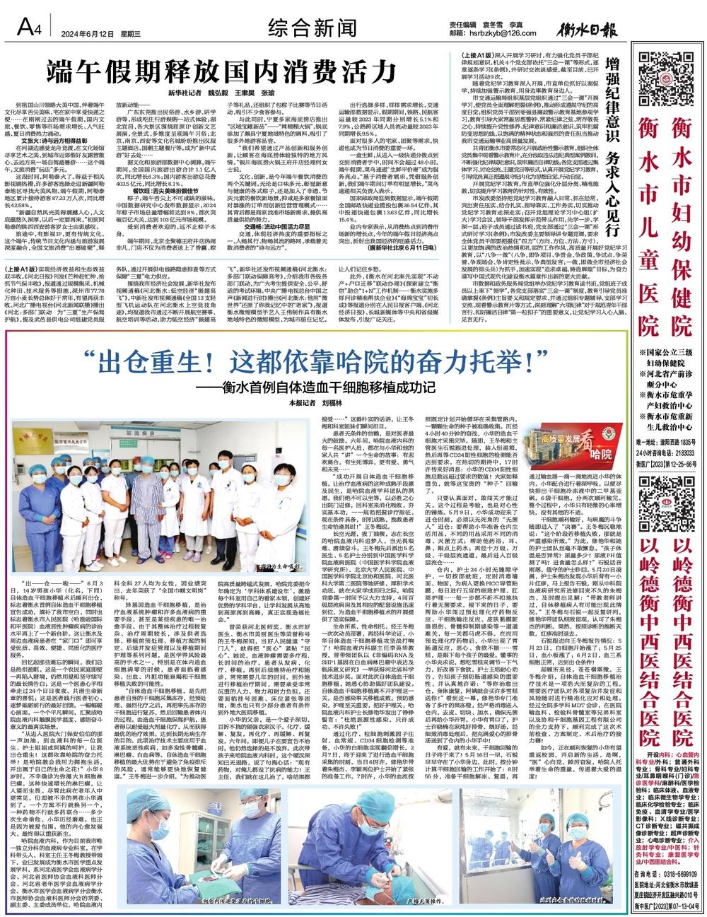 “出——倉(cāng)——啦——”6月3日,14歲男孩小華(化名)自體造血干細(xì)胞移植術(shù)后順利出倉(cāng),標(biāo)志著衡水首例自體造血干細(xì)胞移植宣告成功,填補(bǔ)了我市空白,同時(shí)也標(biāo)志著衡水市人民醫(yī)院(哈勵(lì)遜國(guó)際和平醫(yī)院)血液惡性腫瘤疾病的診治水平再上了一個(gè)新臺(tái)階。這讓衡水及周邊血液病患者在“家門(mén)口”即可享受優(yōu)質(zhì)、高效、便捷、同質(zhì)化的醫(yī)療服務(wù)。