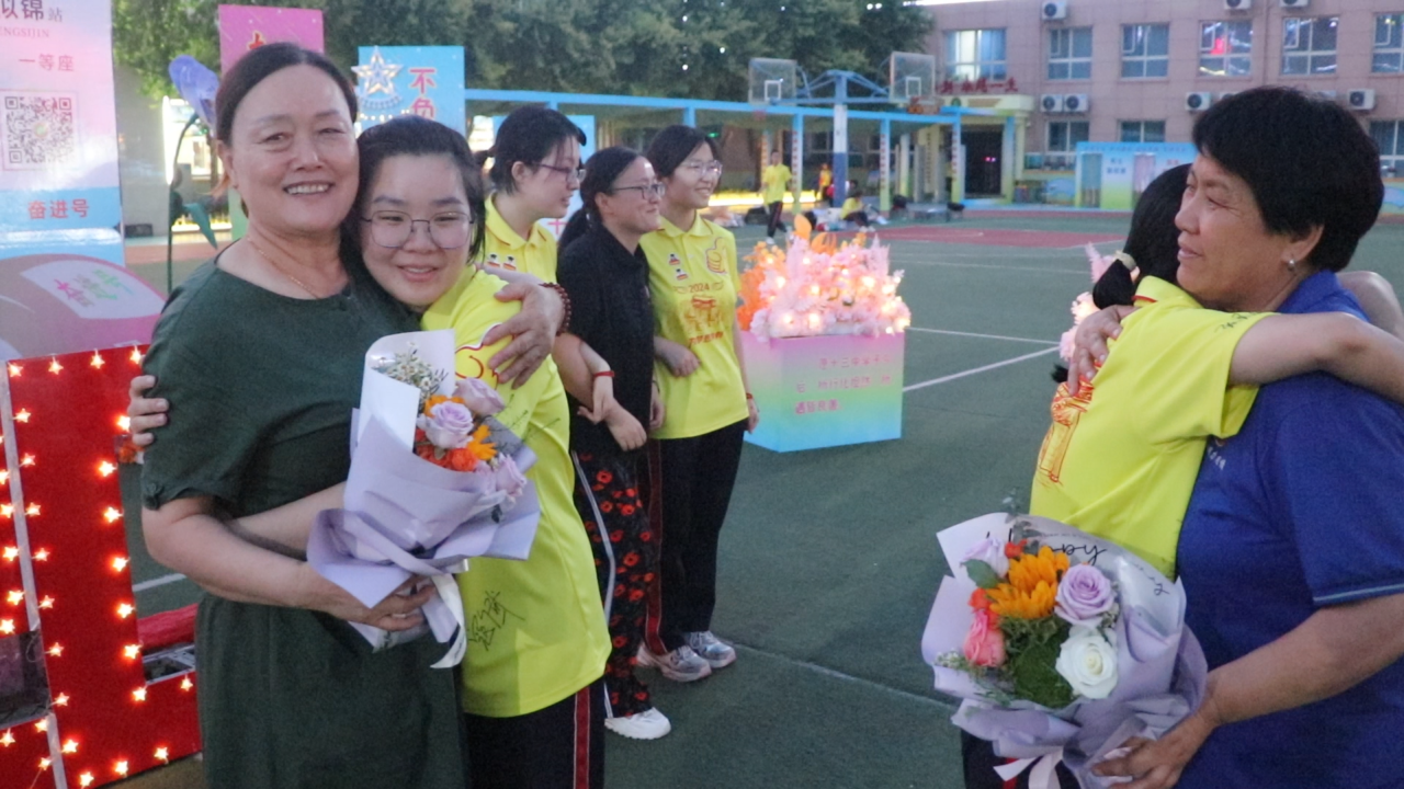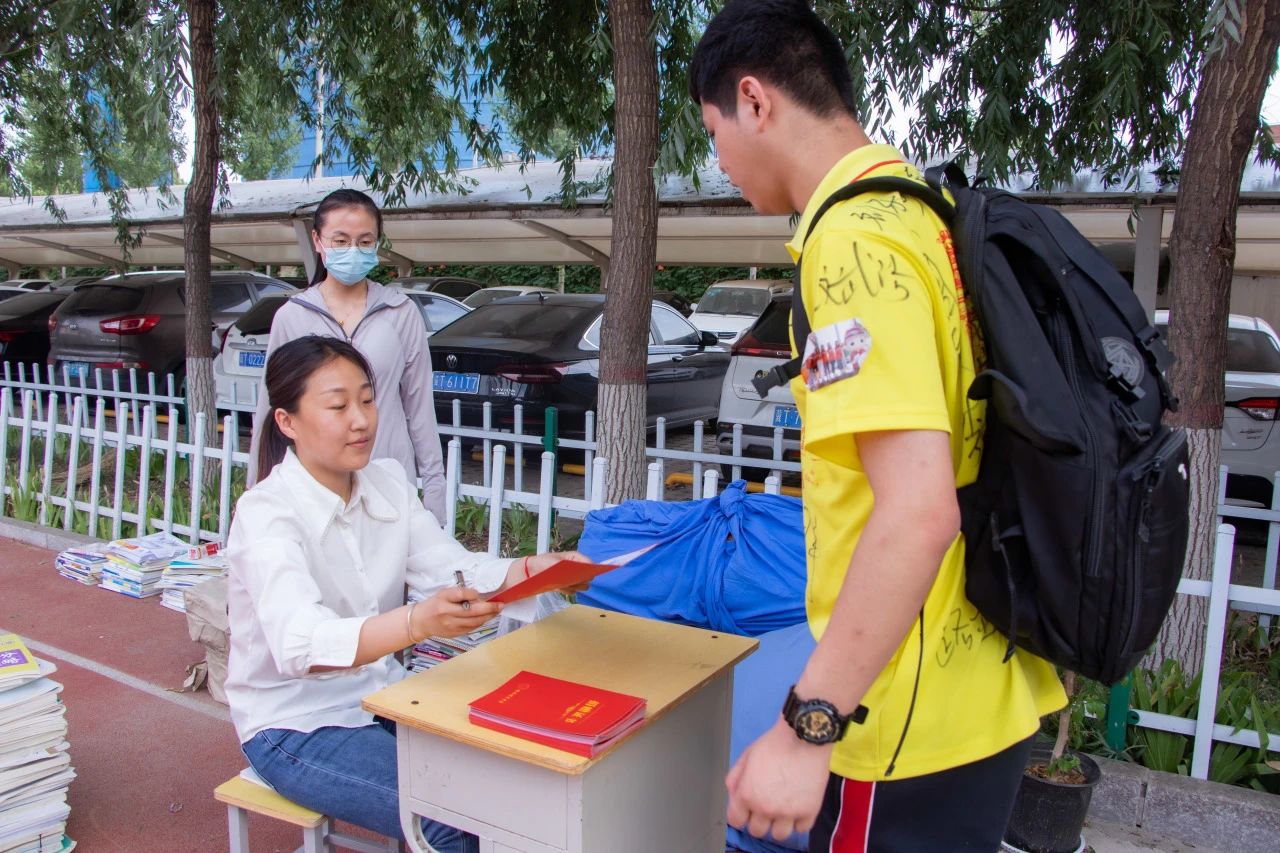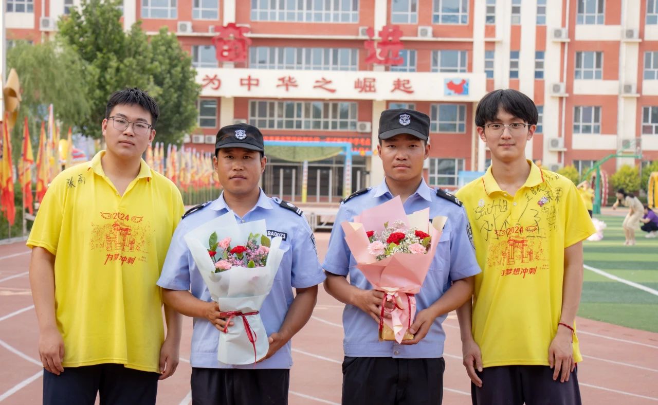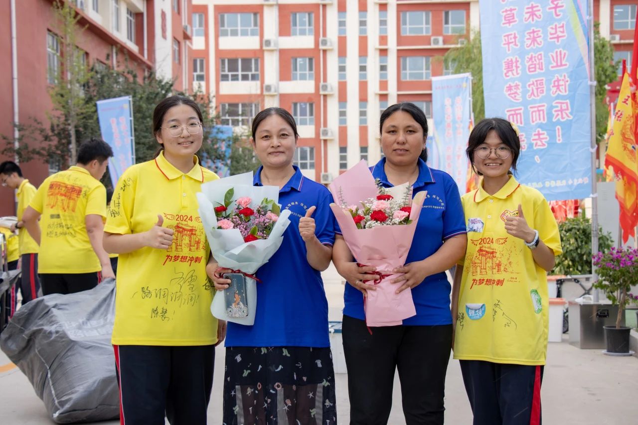在離校前,畢業學子為在本次高考中為大家提供服務的民警、學校工作人員送上鮮花,并向學校食堂師傅、宿管老師鞠躬致謝,和他們開心擁抱,表達了對他們的感激之情。
