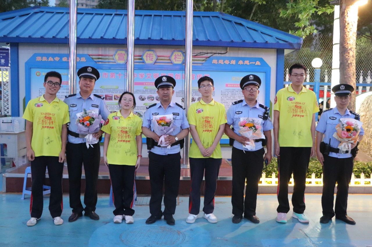 十三中2024屆畢業生向為高考辛苦付出的民警獻花表示謝意。
