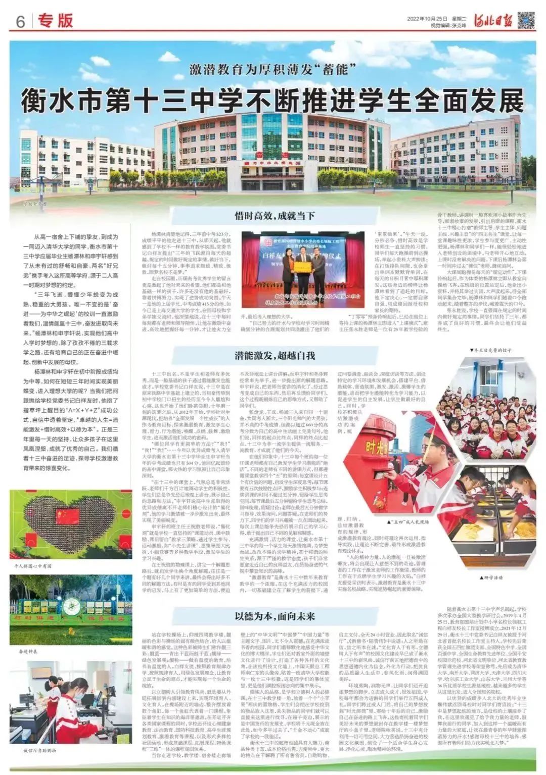 近年來(lái),學(xué)校發(fā)揚(yáng)“惟真惟實(shí),唯先必爭(zhēng)”的精神,走出了一條奮進(jìn)崛起之路,探索發(fā)展之路,改革創(chuàng)新之路,創(chuàng)造了一個(gè)個(gè)“低進(jìn)高出、高進(jìn)優(yōu)出”的成長(zhǎng)奇跡。隨著辦學(xué)聲譽(yù)的提升,學(xué)校先后成為清華大學(xué)、南開大學(xué)、同濟(jì)大學(xué)、四川大學(xué)、哈爾濱工業(yè)大學(xué)、西安交通大學(xué)、中南大學(xué)等36所優(yōu)質(zhì)學(xué)校生源基地校。學(xué)校先后榮獲全國(guó)五四團(tuán)支部、全國(guó)平安校園示范校、全國(guó)百?gòu)?qiáng)中學(xué)、全國(guó)生命教育先進(jìn)單位、河北省文明單位等榮譽(yù)稱號(hào)。