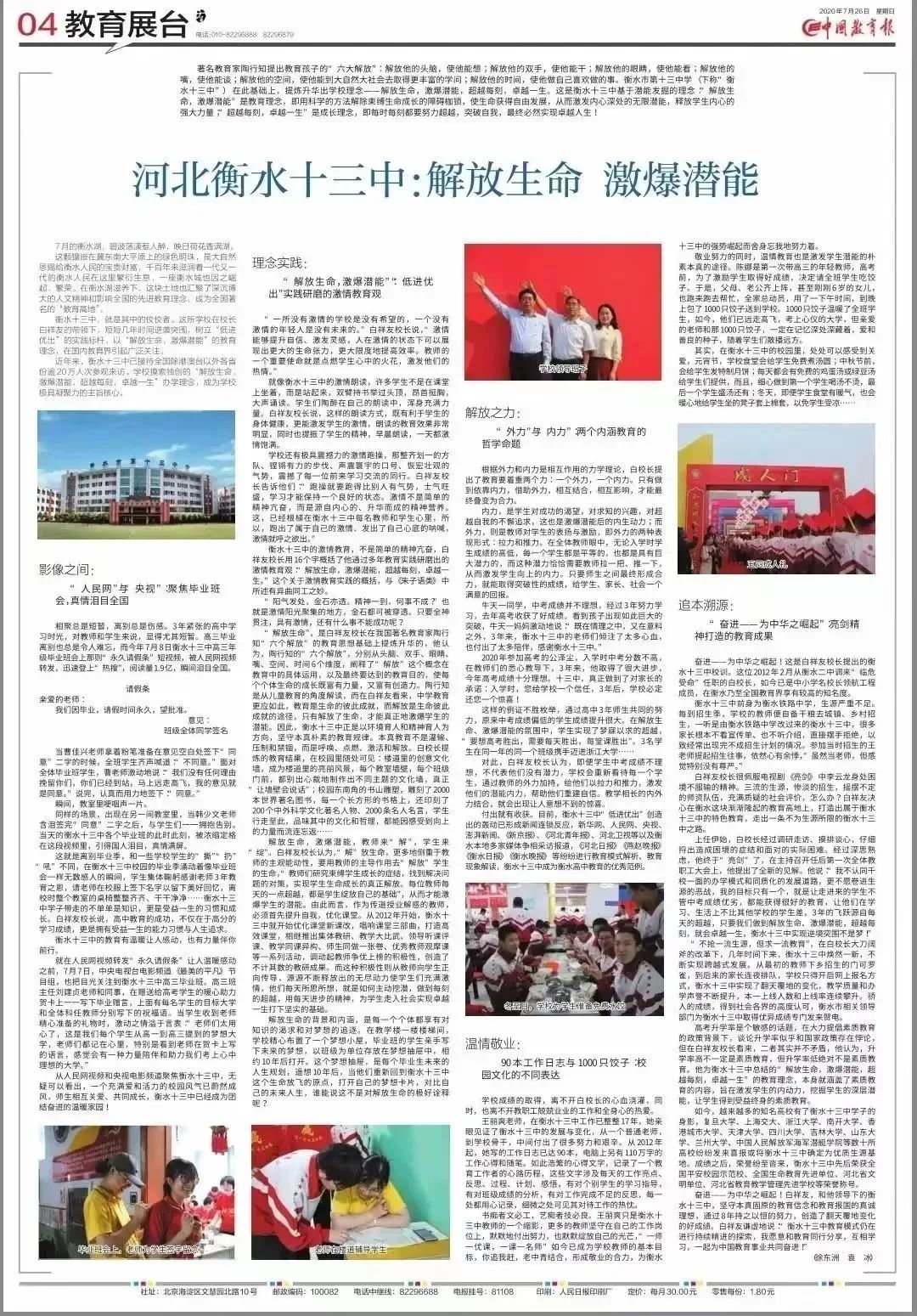 學(xué)校堅(jiān)持“解放生命,激爆潛能,超越每刻,卓越一生”的教育理念,圍繞“全面培養(yǎng),個(gè)性發(fā)展”的教育目標(biāo),以三維課程體系為教育載體,實(shí)現(xiàn)立一個(gè)志、樹一種德、轉(zhuǎn)一個(gè)念、造一個(gè)場(chǎng)、聚一顆心、給一種愛、用一對(duì)力、解一道題的“八個(gè)一”教育方略,在激潛教育理論體系的指導(dǎo)下,持續(xù)優(yōu)化教育品質(zhì),努力辦好有質(zhì)量、有溫度、有內(nèi)涵的教育,真正做到“讓學(xué)生成長(zhǎng),讓人民滿意,讓國(guó)家強(qiáng)大”。