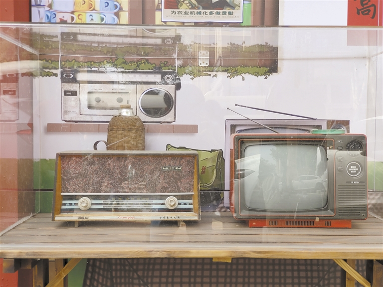 黑白電視、鋤頭、木犁、鐵耙、獨輪車、玉米脫粒機、風谷機,這些具有年代感的老物件,一一陳列在百花西路街巷上,漫步