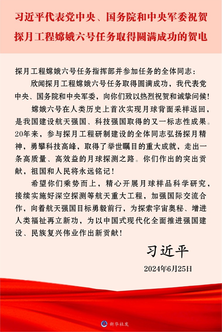 習近平代表黨中央、國務院和中央軍委致電祝賀探月工程嫦娥六號任務取得圓滿成功