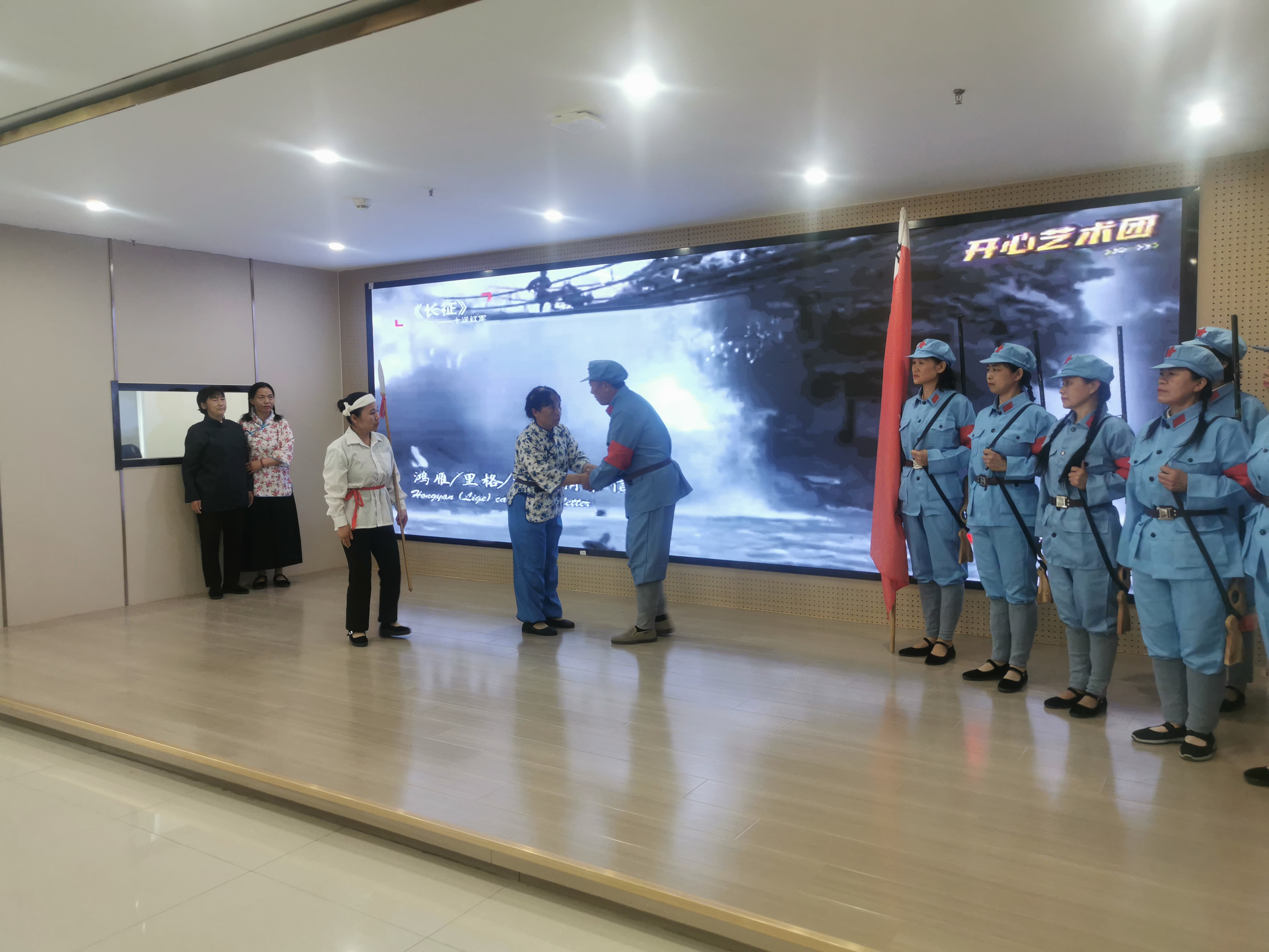 緊接著,舞臺上的大屏幕開始播放《回顧百年黨史》的視頻。
