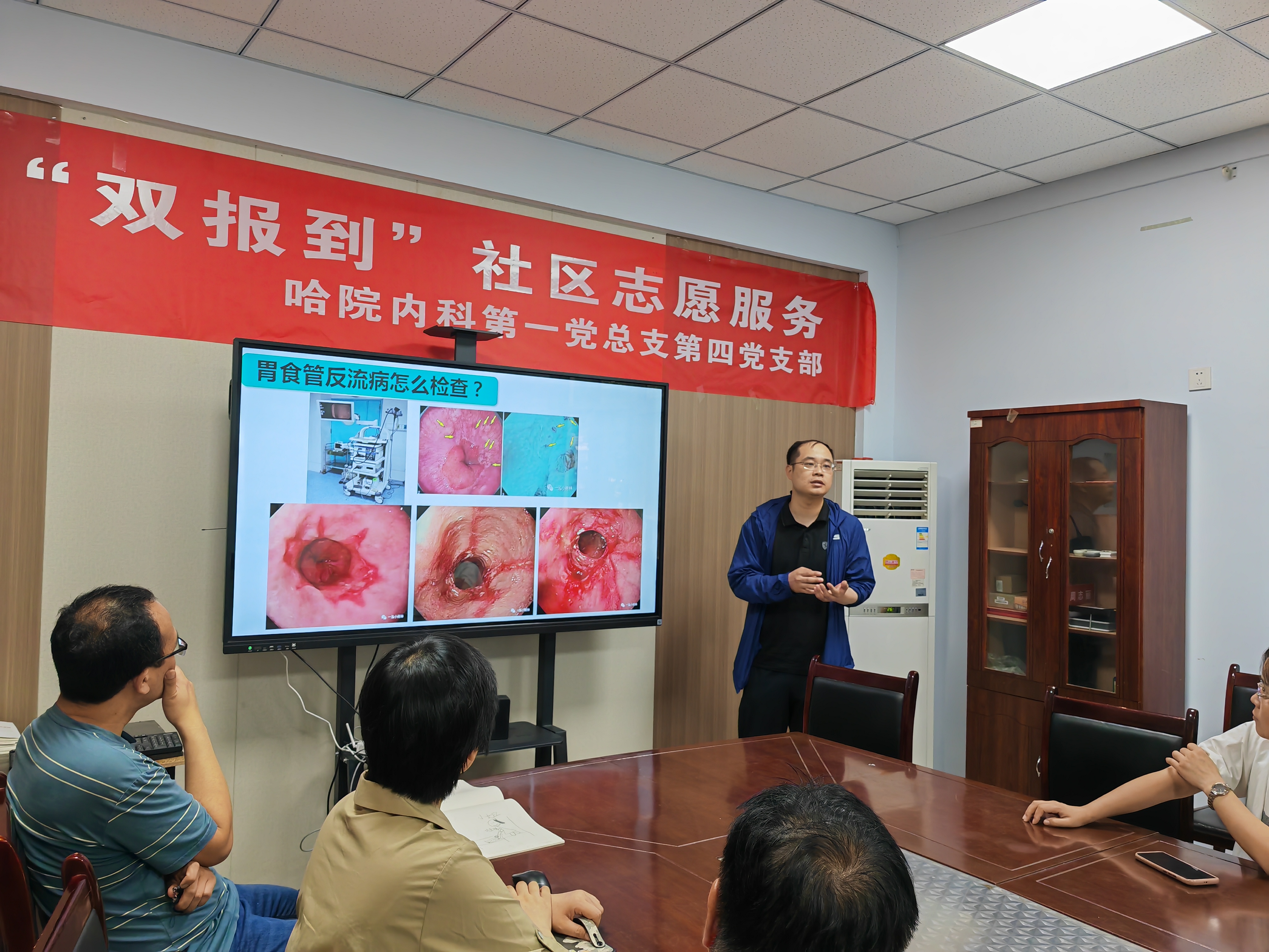 消化道早癌,是指浸潤(rùn)深度不超過(guò)粘膜下層或局限于粘膜層的消化道癌癥,包括早期食管癌、早期胃癌,而不論其大小及是否有淋巴結(jié)轉(zhuǎn)移。消化道早癌的癥狀就是沒(méi)有癥狀,一般腫瘤發(fā)展到中晚期才會(huì)出現(xiàn)一些較為明顯的癥狀。“早預(yù)防、早篩查、早診斷、早治療”是消化道癌防治的關(guān)鍵,哈院消化內(nèi)科在早癌防治方面走在了前列。消化內(nèi)鏡檢查,能早期發(fā)現(xiàn)和診治消化道早癌及癌前病變。通過(guò)特殊的光染色及放大技術(shù),將可疑病灶放大幾百倍,讓胃腸道早期病變凸現(xiàn)出來(lái)并放大,避免初期無(wú)癥狀的胃腸道早癌被忽視。而國(guó)家衛(wèi)健委胃癌篩查與早診早治(2024年版)方案中明確,胃腸鏡是篩查消化道癌癥的金標(biāo)準(zhǔn)。哈院消化內(nèi)科醫(yī)生蘇淼,是哈院博士團(tuán)的重要成員,因突出表現(xiàn)而被評(píng)為優(yōu)秀黨員。他細(xì)致講解了消化道早癌防治,并就在全省率先成功開(kāi)展內(nèi)鏡黏膜下剝離術(shù)等,進(jìn)行了精彩講解。在講解時(shí),有居民就就醫(yī)過(guò)程中遇到的問(wèn)題,蘇淼給予貼心答疑。