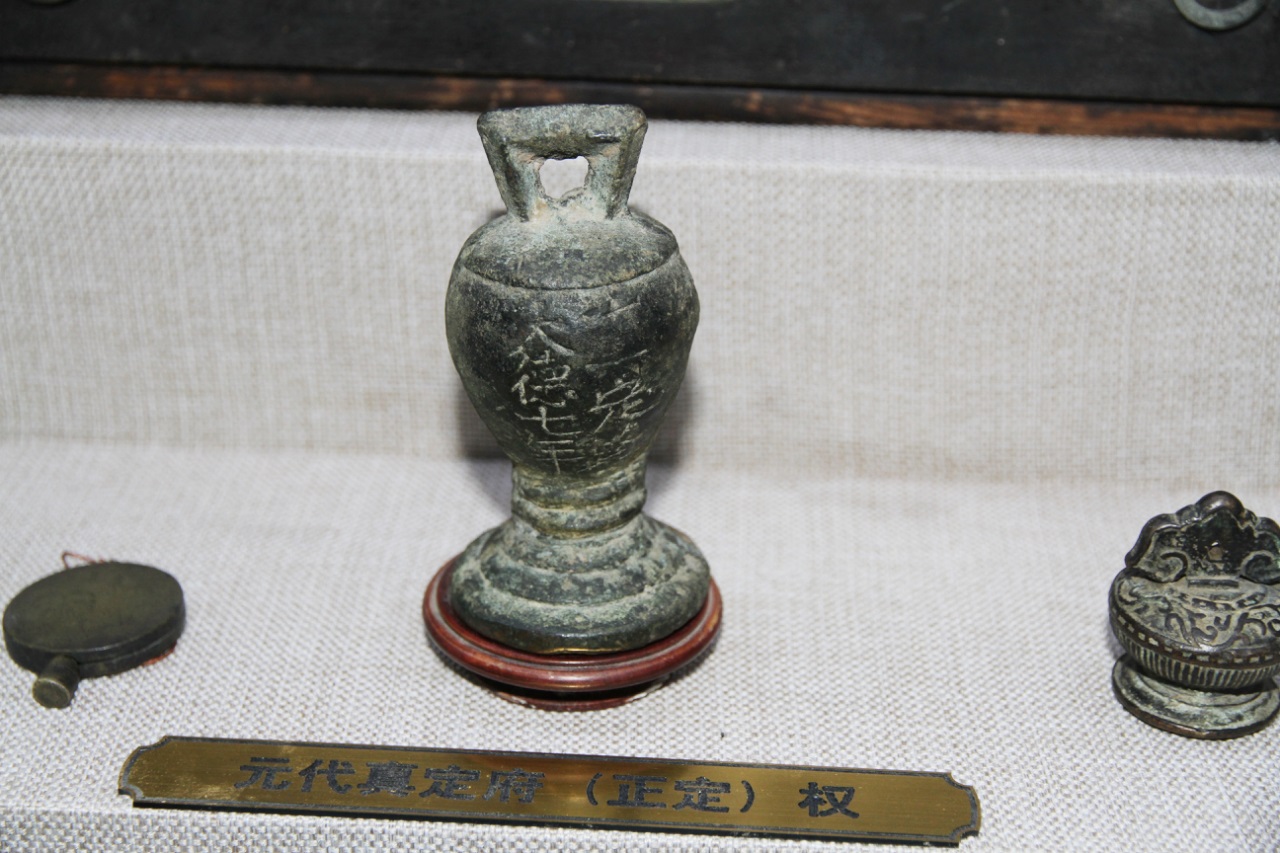 “走,先帶你去看看我們館的鎮館之寶。”當日上午9時許,跟隨賈廣田的腳步,記者來到位于博物館北側的櫥窗前。“這枚高約13厘米,直徑約6厘米的‘秤砣’是元代真定府權。”賈廣田介紹,這枚權器型規整,銹色厚重,其底部是臺階式,腹部呈束腰型,上面寫著“大德七年 真定路 中山府”,有著元代秤砣的顯著特點。
