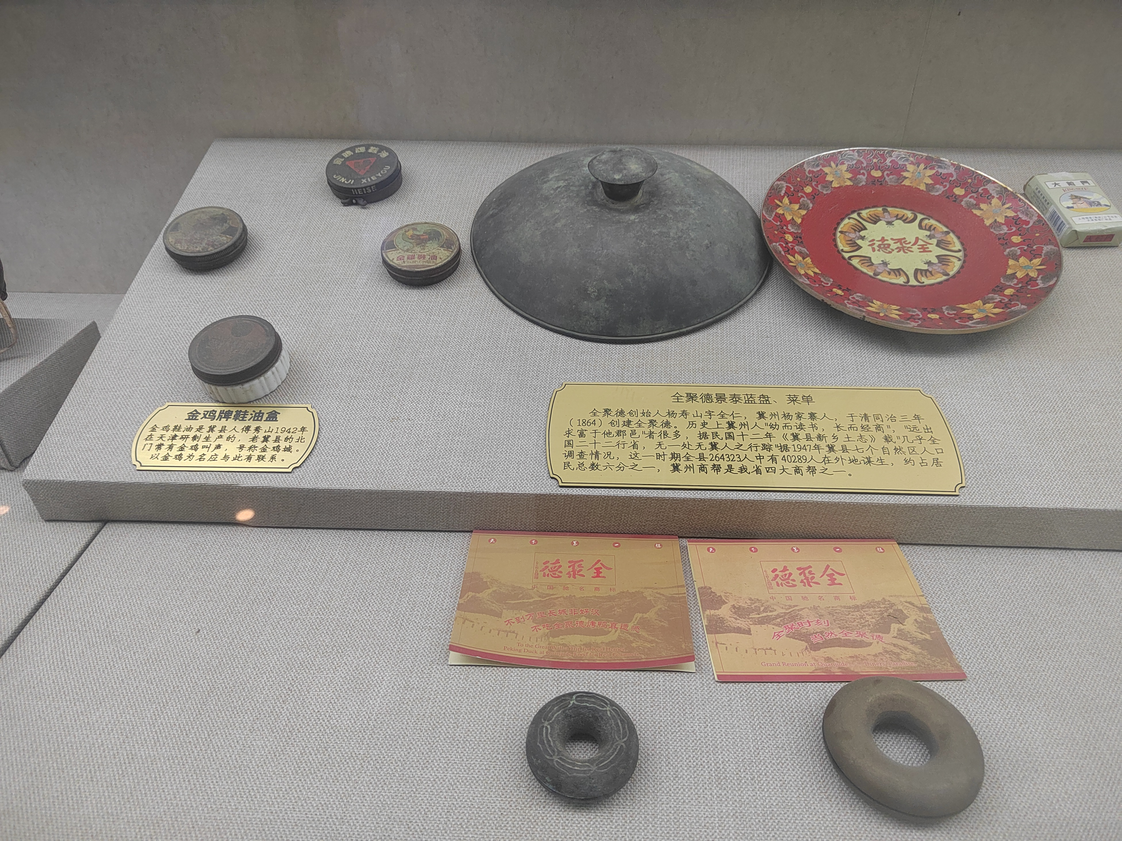 漫步冀商博物館,走商貨挑、鋦盆鋦碗工具箱、貨郎鼓、泊頭火柴廠股票……一件件珍貴文物向人們講述著冀商故事。展廳一隅,一個印有“全聚德”的景泰藍盤和一個刻有“全聚德”字樣的鍋蓋吸引了記者的目光。“全聚德的創始人楊壽山是冀州楊家寨人,于清同治三年(1864年)創建全聚德。”賈廣田告訴記者,這兩個物件是20多年前他在北京古玩市場“淘寶”所得。“這4個金雞牌鞋油盒,是2006年我去天津出差,在逛古玩市場時淘到的。”賈廣田指著藏品介紹,金雞鞋油是冀州人傅秀山1942年在天津研制生產的,聽說老冀縣的北門常有金雞叫聲,號稱“金雞城”,以“金雞”為名也許與此有著密切的聯系。
