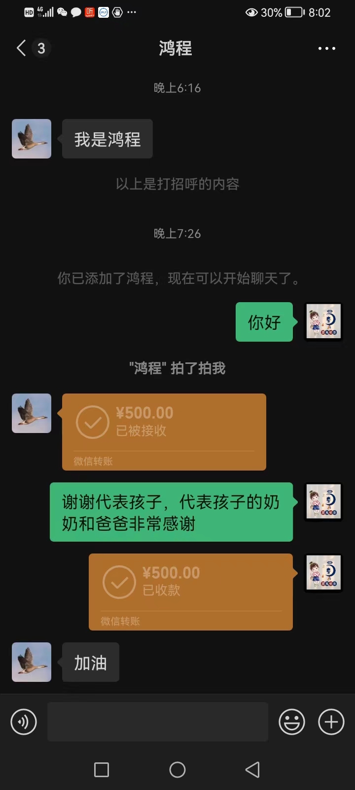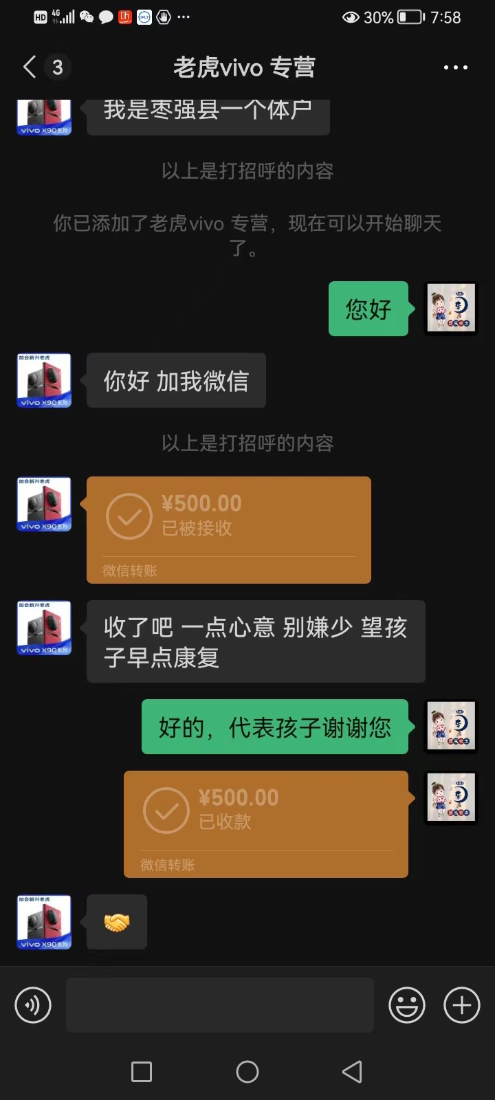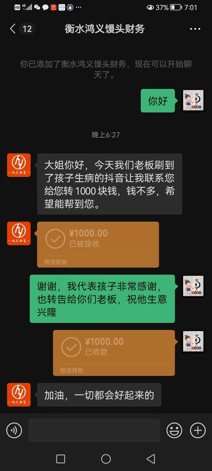 在愛心善款中,記者看到,捐款的人中有全職寶媽,有單位職工,有個體商戶,還有企業(yè)工廠。一家不公開名字的愛心企業(yè)直接為張奧盈轉(zhuǎn)賬一萬元;一家署名“衡水鴻義饅頭”的公司,為奧盈轉(zhuǎn)賬一千元;一位孩子媽媽看了視頻后,感同身受,也捐款500元;一位在深州舊州中學就讀的高三學生,也打來電話想要為自己的同齡人捐獻愛心……一筆筆愛心捐款,匯聚成涓涓細流,為張奧盈的治療之路匯聚了新的活力。