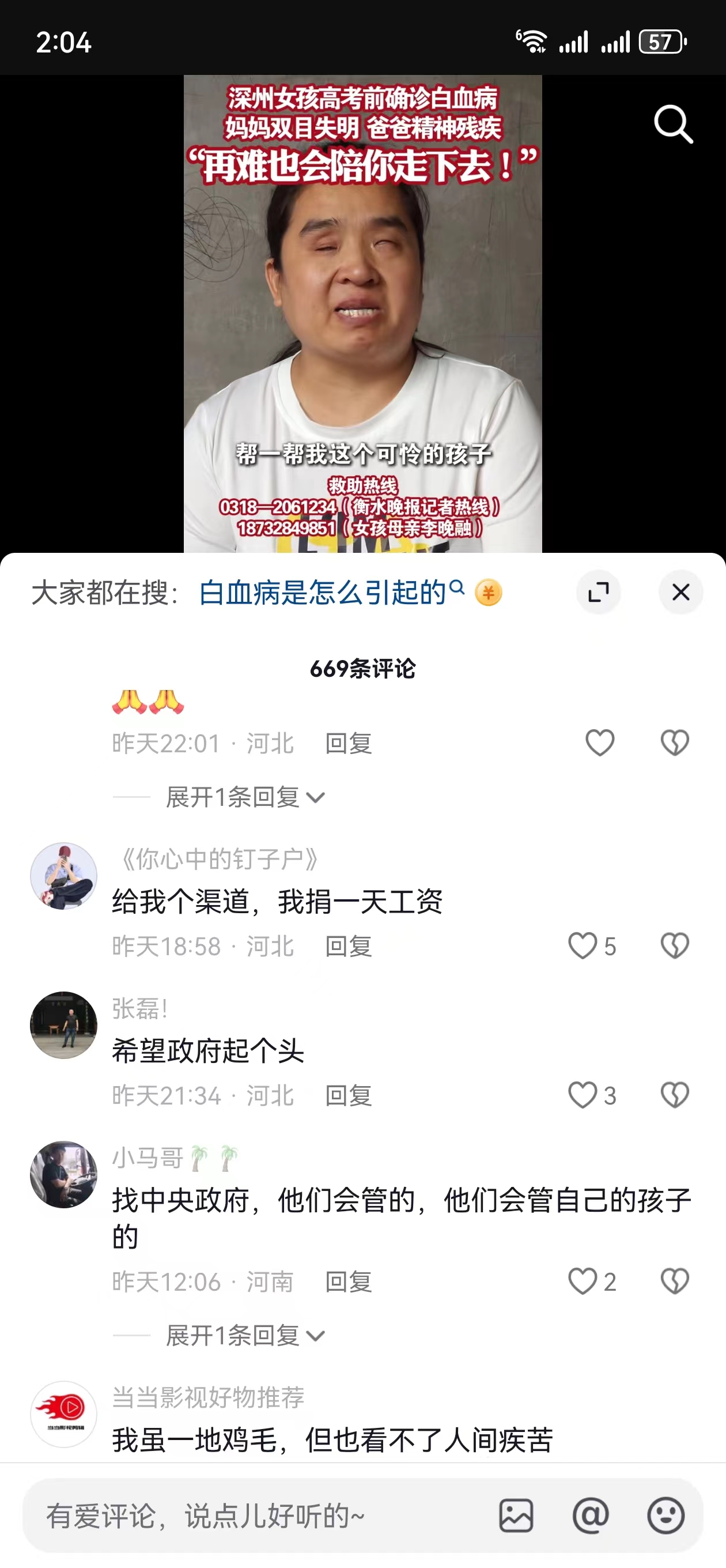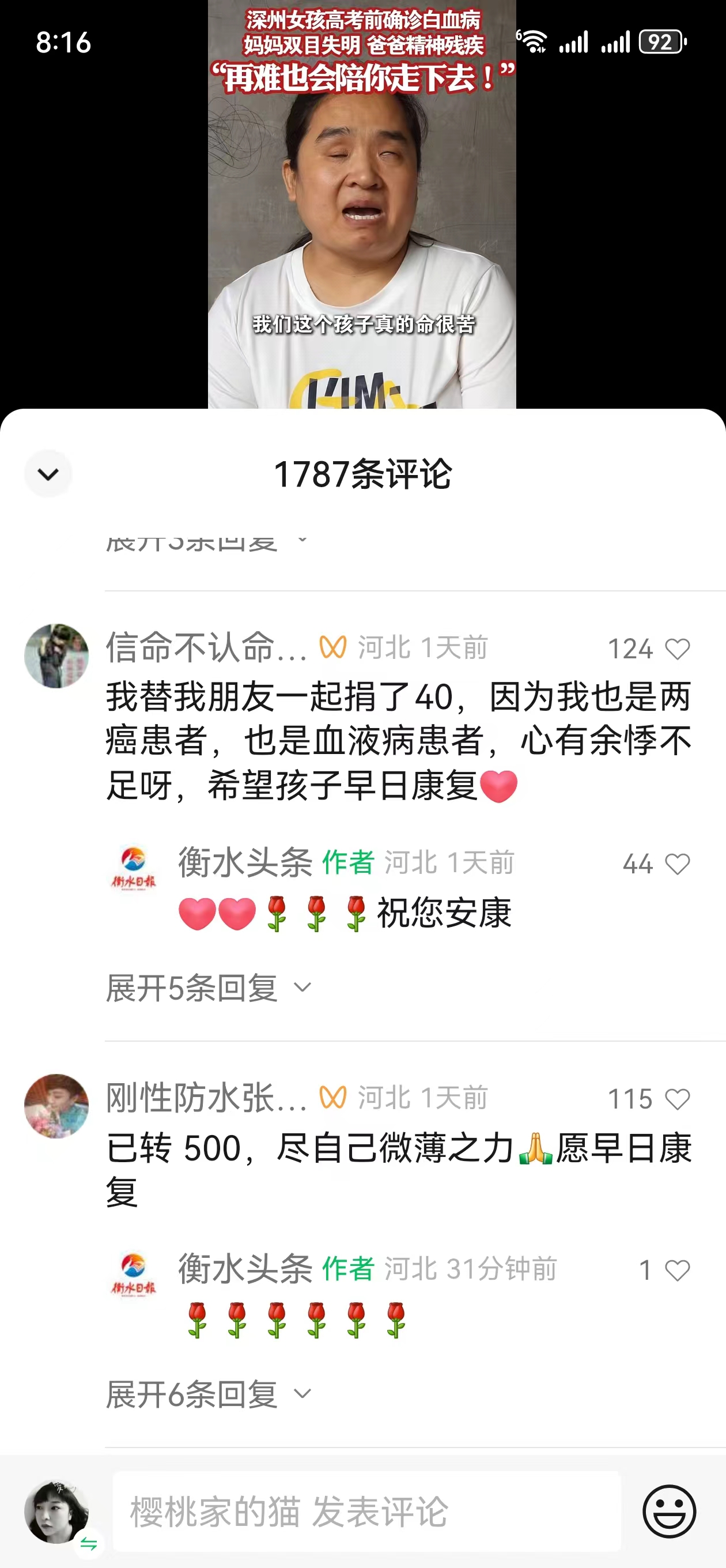 在發(fā)布的每一條和張奧盈有關(guān)的視頻報道下方,評論區(qū)中匯聚著一個個暖心的留言。網(wǎng)友“信命不認命”本身是兩癌患者,也是血液病患者,他留言道:“我和我朋友一起捐了40元,心有余而力不足,希望孩子早日康復。”網(wǎng)友“每一天都是開心的”也是白血病人,她也捐款50元表達心意,她還留言:“我目前在廊坊某中醫(yī)院服用中藥,希望可以幫助到您。”滄州網(wǎng)友“善解人意”留言道:“我沒有能力幫錢。如果孩子需要輸血,我獻血給她,我是O型血。”網(wǎng)友“你心中的釘子戶”說:“給我個渠道,我捐一天工資”……