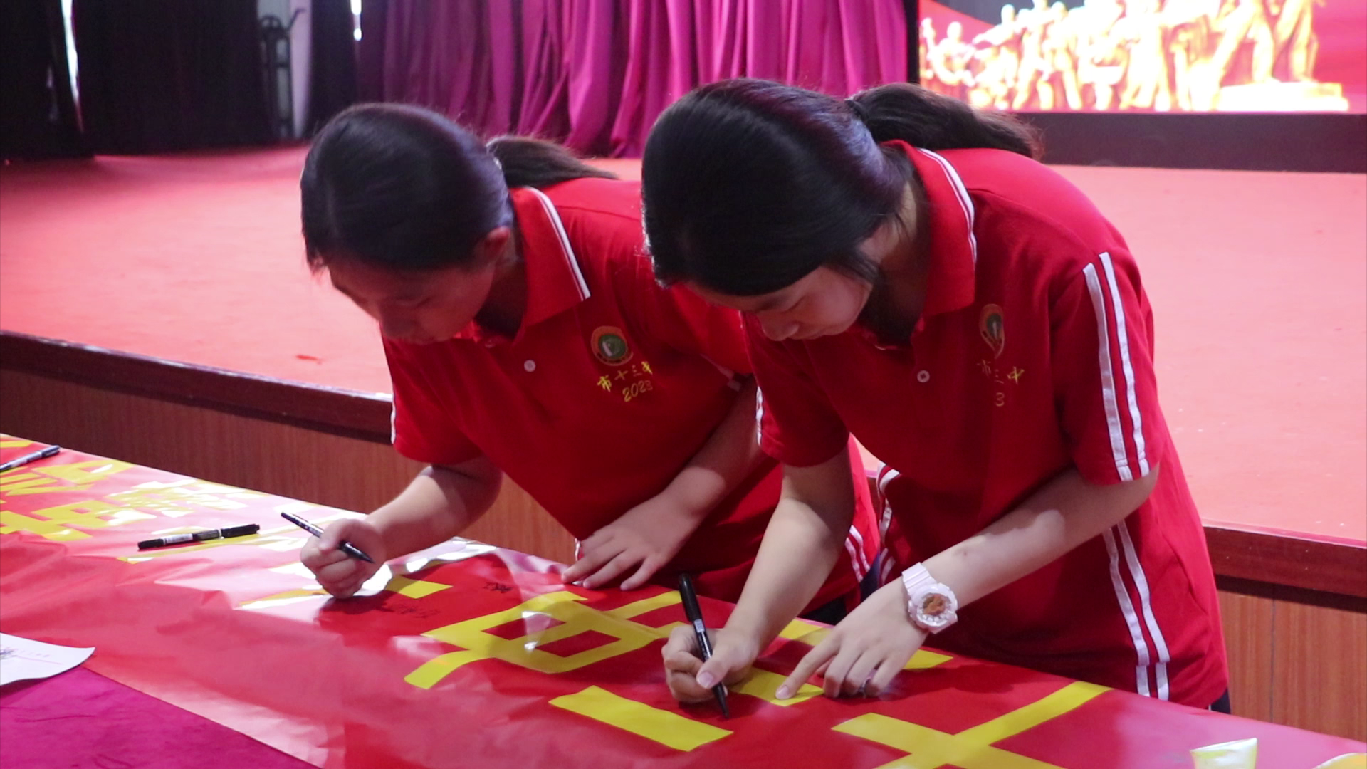 同學們在“勿忘國恥,強國有我”條幅上鄭重簽下自己的名字,這不僅是一份承諾,更是一份責任與擔當。全體師生舉起右拳,共同宣誓,鏗鏘有力的誓言,表達了大家矢志不渝的愛國情懷和奮發向上的精神風貌,激勵著每一個人為祖國的繁榮昌盛貢獻自己的智慧和力量。