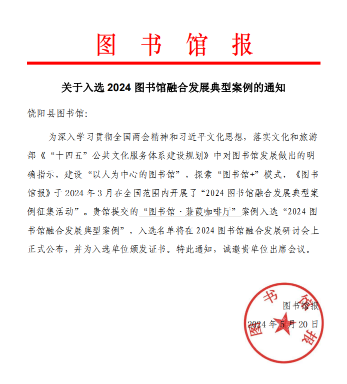 近日,由圖書館報主辦的2024圖書館融合發(fā)展研討會在江蘇省常州市舉行。其中,衡水市饒陽縣圖書館“圖書館·蒹葭咖啡廳”案例成功入選“2024 圖書館融合發(fā)展典型案例”。本次獎項的獲得,標志著饒陽縣圖書館在推動圖書館融合發(fā)展方面的創(chuàng)新實踐得到了業(yè)界認可。