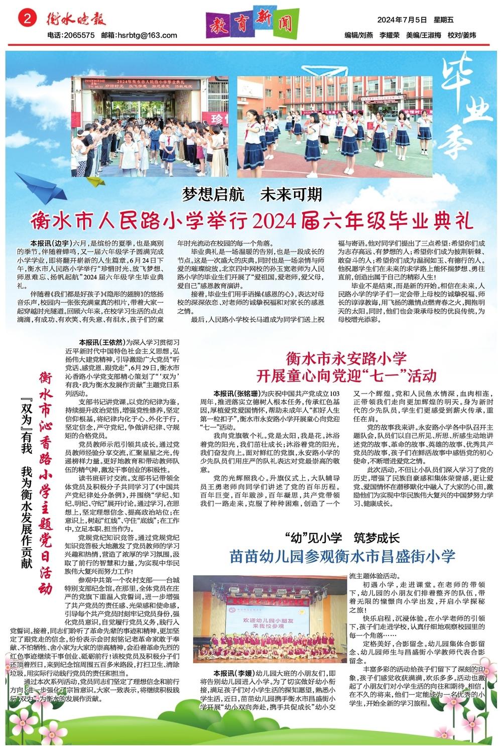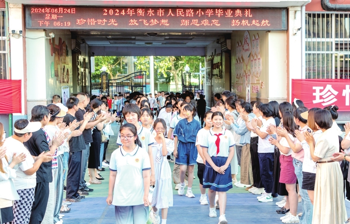 本報(bào)訊(邊宇)六月,是繽紛的夏季,也是離別的季節(jié)。伴隨著蟬鳴,又一屆六年級(jí)學(xué)子圓滿(mǎn)完成小學(xué)學(xué)業(yè),即將翻開(kāi)嶄新的人生篇章。6月24日下午,衡水市人民路小學(xué)舉行“珍惜時(shí)光、放飛夢(mèng)想、師恩難忘、揚(yáng)帆起航”2024屆六年級(jí)學(xué)生畢業(yè)典禮。