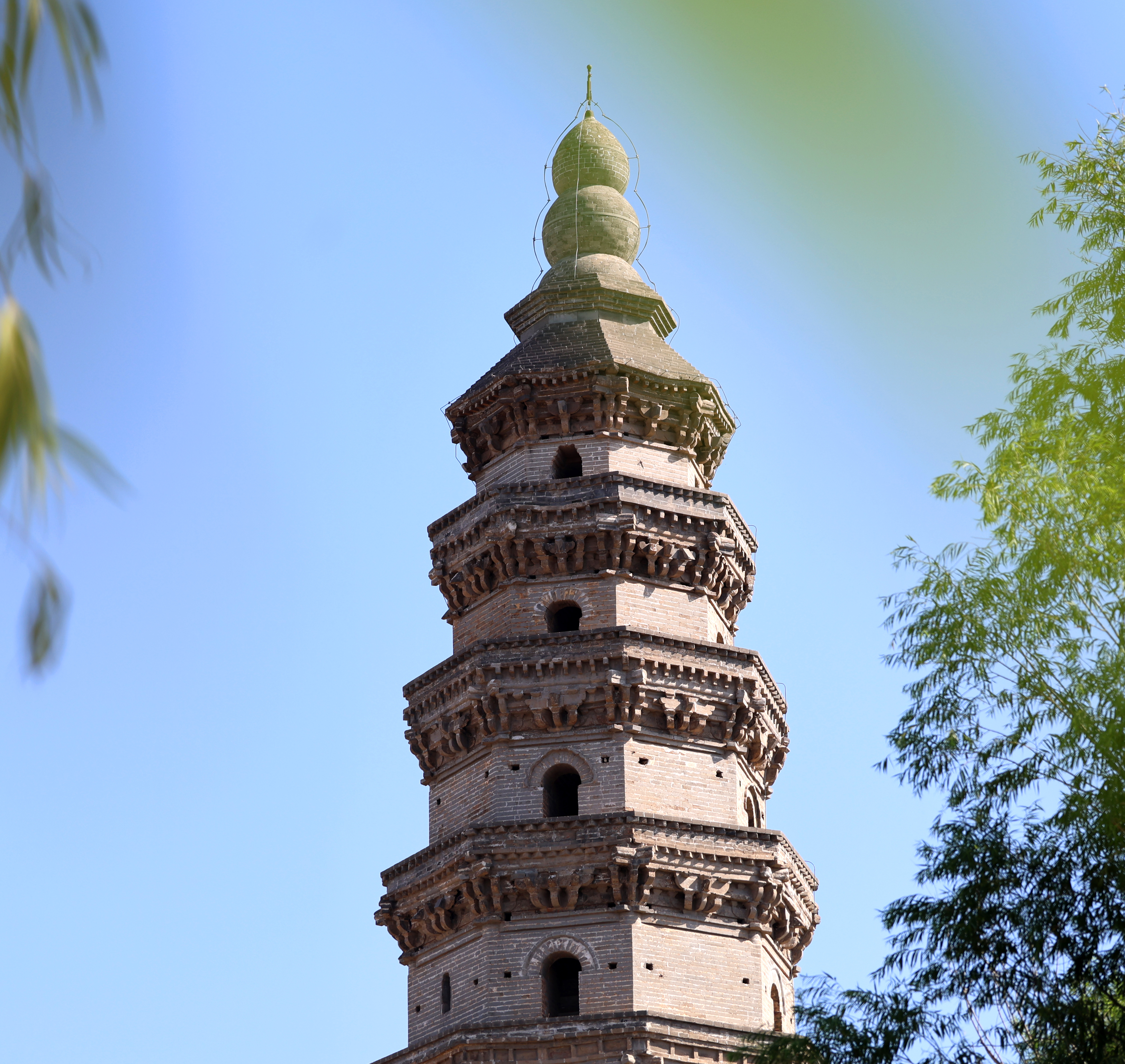 在桃城區文物所所長翟曉娜的引領下,記者進入寶云寺,沿著兩側種有冬青和松柏的青磚小路,來到寺內東側,寶云塔全貌盡收眼底。這座原名擎天塔的樓閣式磚塔,呈八面棱錐體,共9層,高32.64米,塔基周長28.8米。因古塔在寶云寺院內,后來也沿用了寺的名字叫寶云塔。關于其始建年代,《衡水縣志》有隋朝大業二年和唐代建造兩種記載,但均無碑志可證。1980年,中國科學院自然科學史研究所的張馭寰教授對寶云塔進行了實地考察,鑒定為北宋初期所建。