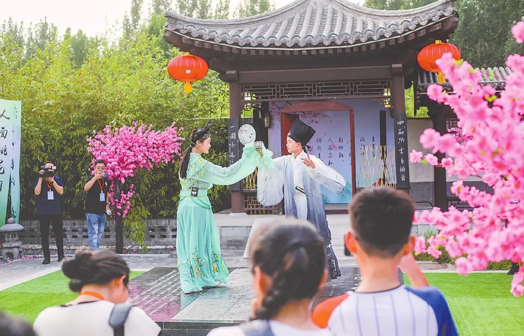 在我國傳統(tǒng)戲曲中,經(jīng)常出現(xiàn)才子佳人的戲碼。7月8日,衡水園博園里,上演了一出唐朝才子崔護(hù)與長安城郊少女的曠世佳話《人面桃花》。