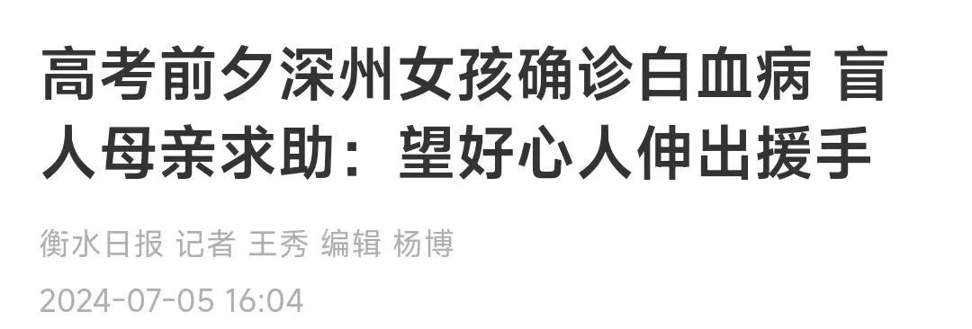深州18歲女孩張奧盈,在高考前半個月查出身患急性白血病。她的媽媽是盲人,爸爸患有精神疾病,高額的醫療費讓女孩和她的父母一籌莫展。
