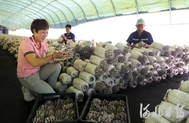 6月22日,平泉市柳溪鎮恒誠食用菌種植基地工作人員采摘袖珍菇。河北日報、河北日報客戶端通訊員李平文攝