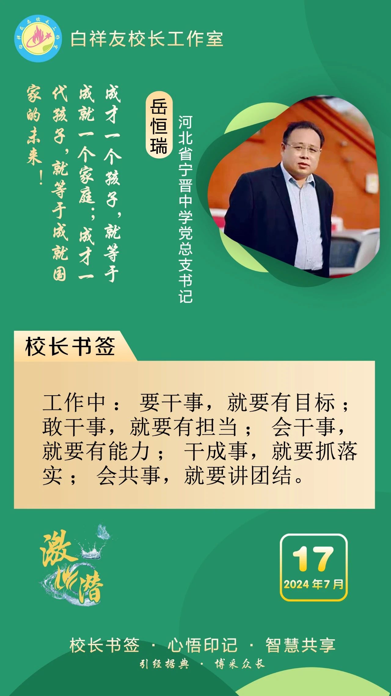 “白祥友校長工作室”成立于2019年4月,是教育部“國培計劃”中小學名校長領航工程、河北省首批名校長工作室,目前省內外成員校20個。工作室堅持“資源共享、智慧共融、互助共贏”理念,已成為思想碰撞的交流場,資源共享的品牌站,成果展示的輻射源。