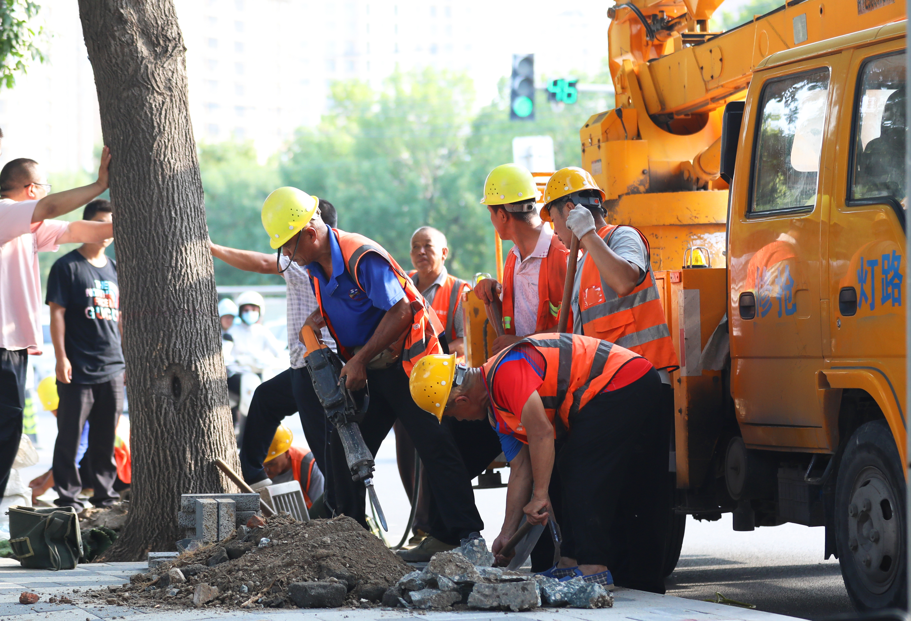 市路燈管理中心施工人員在紅旗南大街進(jìn)行線路改造。