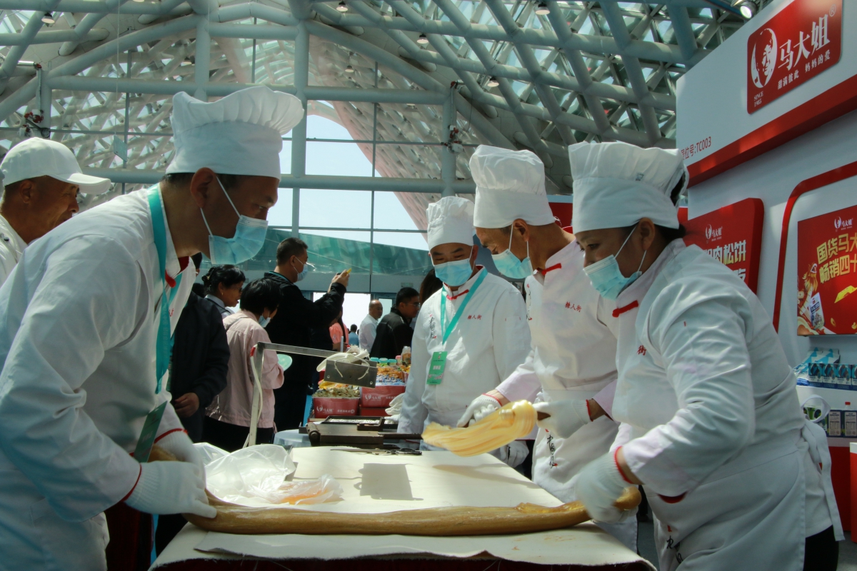 ??在2024第三屆中國(邱縣)食品博覽會食品商展位,參展工作人員進行手工制作糖果展示。劉學(xué)維 攝