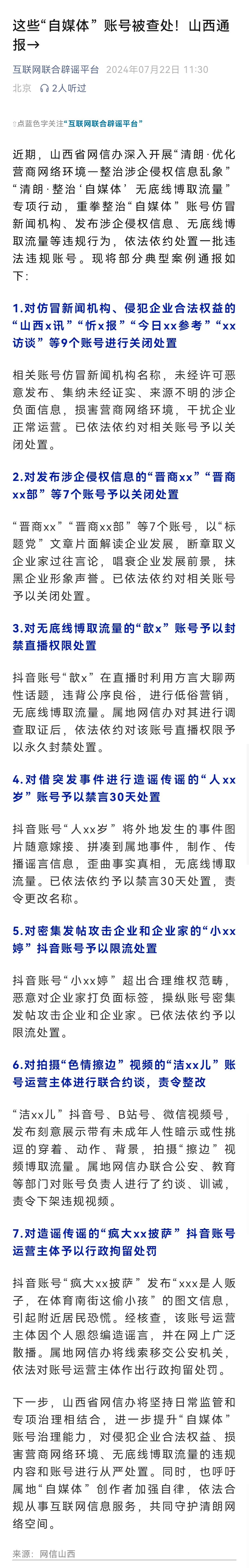 詳情:近期,山西省網信辦深入開展“清朗·優化營商網絡環境—整治涉企侵權信息亂象”“清朗·整治‘自媒體’無底線博取流量”專項行動,重拳整治“自媒體”賬號仿冒新聞機構、發布涉企侵權信息、無底線博取流量等違規行為,依法依約處置一批違法違規賬號。現將部分典型案例通報如下: