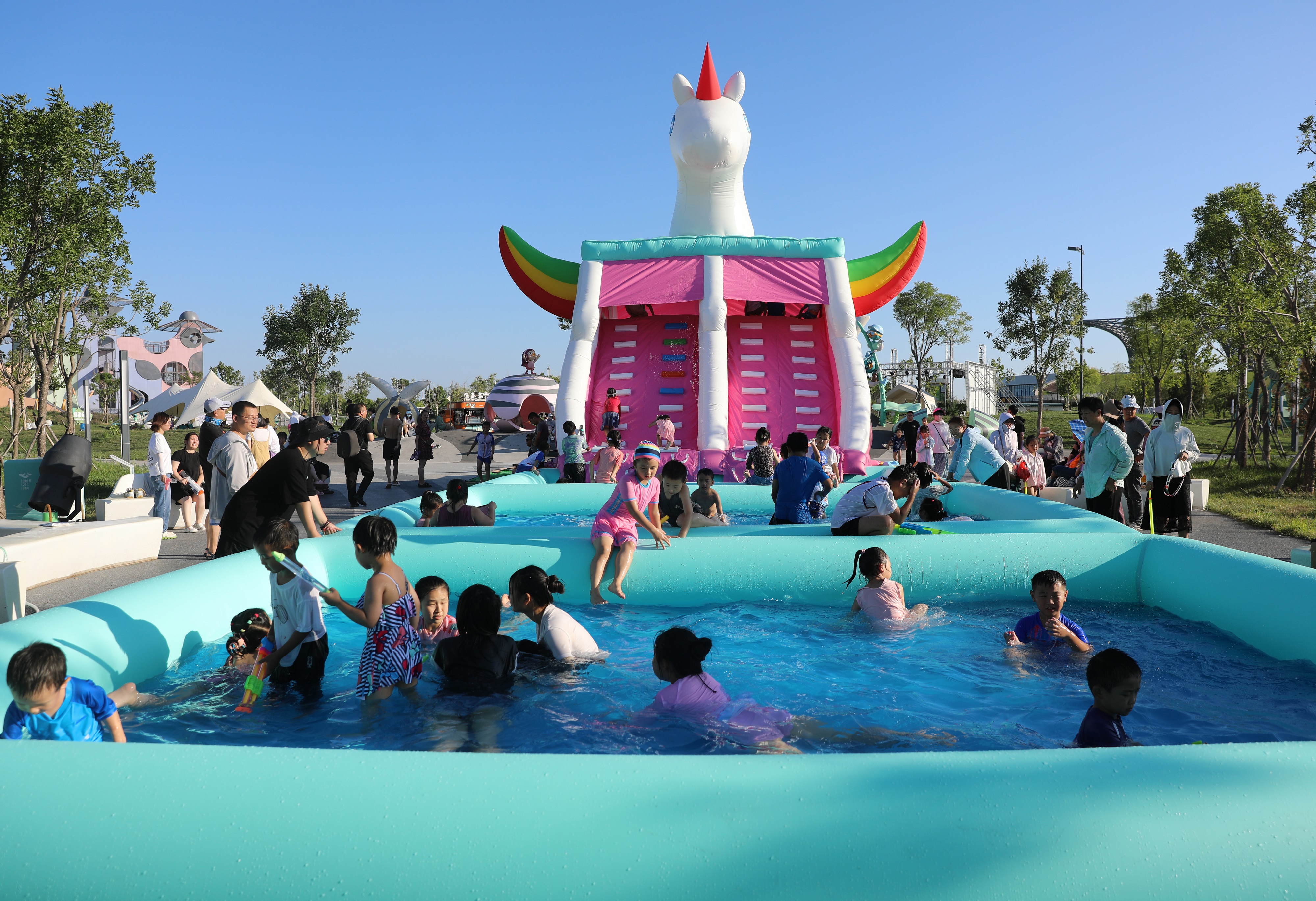 跟隨“大魔王”一路行至鴨鴨樂園戲水節入口,一場全新的“親子劇情沉浸式水戰對抗賽”正式開始,在幾個大型水上充氣城堡里,所有人不管認識與否,就一個字“潑”。只見大家準備了各式各樣的“武器”,有的拿水槍,有的拿臉盆,還有人拿著洗車機,就連現場的演員也加入其中,你潑我,我潑你,就算是被潑得滿臉水也是用手抹一把繼續“戰斗”,不管是大朋友還是小朋友,都玩得不亦樂乎。