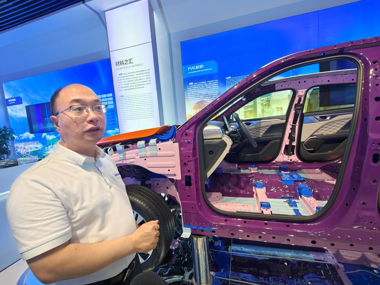 河鋼材料院黨委書記、院長張彩東介紹,汽車模型的結構件和外覆蓋件,不同的顏色代表不同的鋼種和不同的級別。強度最高的是紫紅色的2000MPa級的熱成型鋼,是目前在汽車工業應用強度最高的鋼材。橘紅色的是烘烤硬化鋼,它既保障了成型性,又在噴漆涂裝過程中,在加熱過程中進一步提高鋼材的強度,它的抗凹性很強。綠色的是前后的防撞鋼梁,車輛發生碰撞時,保障車身的不變型,這是980MPa級的。