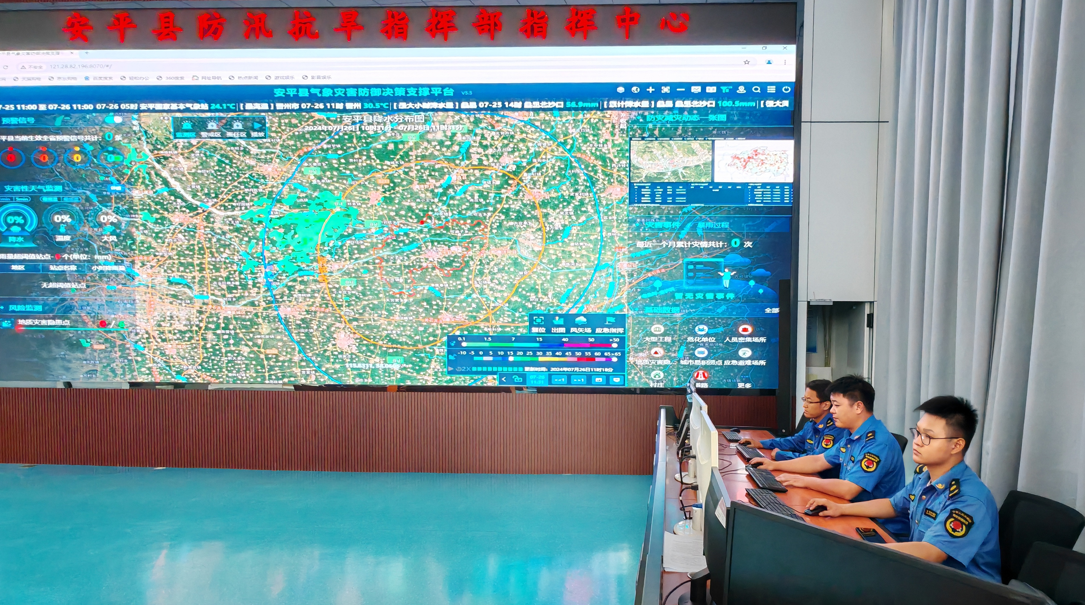 24日,安平縣出現暴雨、雷暴大風天氣,期間最大降雨量達58.7毫米,最大風速達20.0m/s。在安平縣防汛抗旱指揮部內,工作人員正目不轉睛地盯著屏幕,通過不斷切換監控畫面,實時監測路況動態信息。