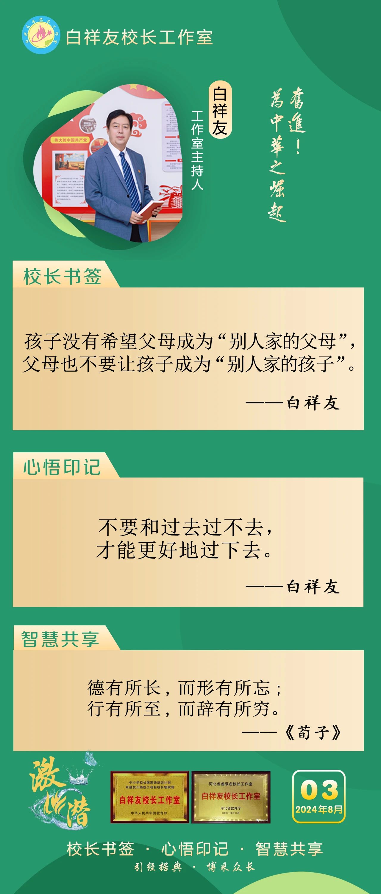 “白祥友校長工作室”成立于2019年4月,是教育部“國培計劃”中小學名校長領航工程、河北省首批名校長工作室,目前省內外成員校21個。工作室堅持“資源共享、智慧共融、互助共贏”理念,已成為思想碰撞的交流場,資源共享的品牌站,成果展示的輻射源。