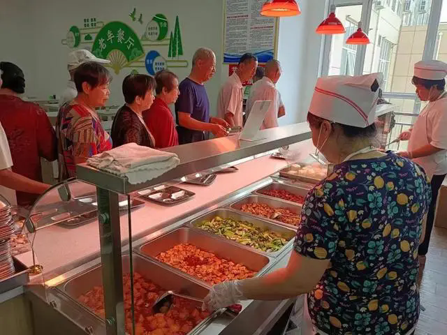8月8日中午11時20分,中華大街街道辦的幸福餐廳里人氣火爆,20多位老人正開心就餐,還有20多位老人在排隊買餐。廚師們正為前來就餐的老年人群體提供熱情周到的打餐服務。