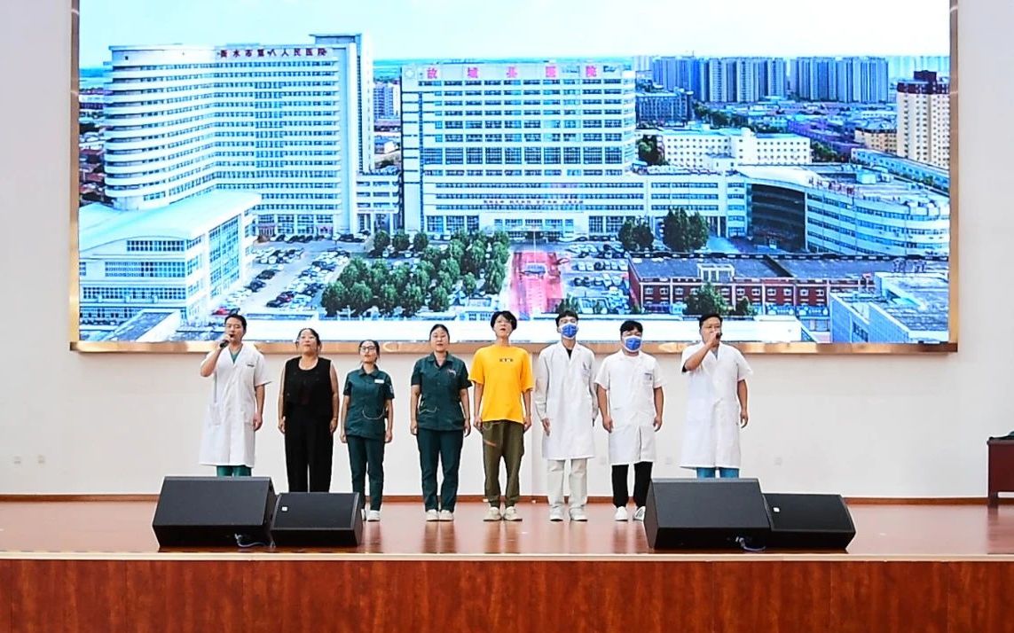 在隨后的慶祝活動中,王平、張騫、王娜娜、馬菱帶來的歌曲《如愿》,用優美的歌聲傳遞出對醫師們的美好祝福。急診科、手術室、骨科聯合呈現的多學科協作情景劇《“救”在你身邊》,生動演繹了醫護人員在緊急時刻的默契配合與勇敢擔當,贏得了陣陣掌聲。活動的尾聲,所有參會人員合唱《相親相愛一家人》,深情的歌聲、熟悉的旋律,溫馨和諧的氛圍彌漫在整個報告廳,充分展現了醫院大家庭的團結與溫暖。