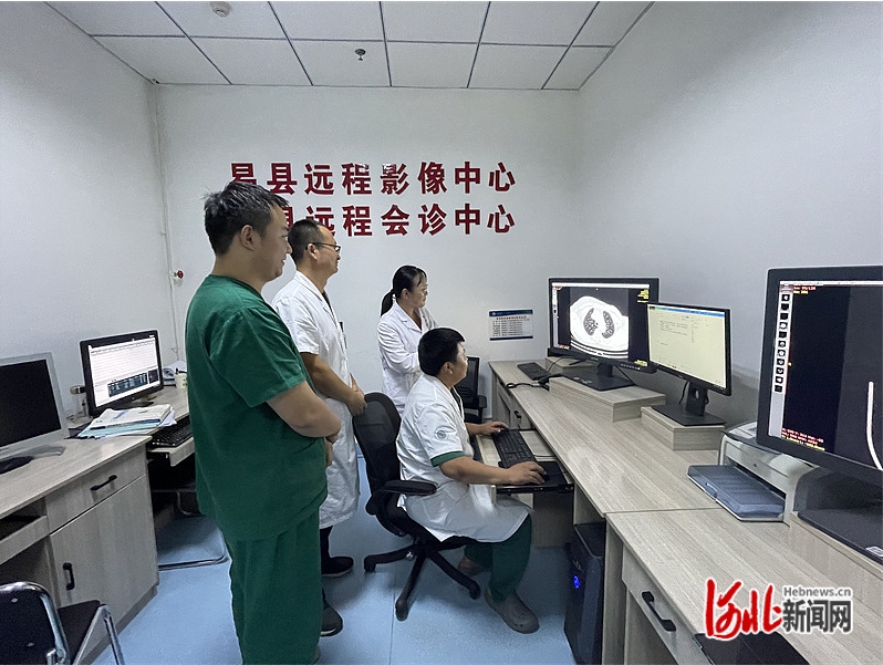 8月6日,易縣遠程影像中心專家們?yōu)猷l(xiāng)鎮(zhèn)衛(wèi)生院拍攝的CT做診斷。易縣醫(yī)院供圖