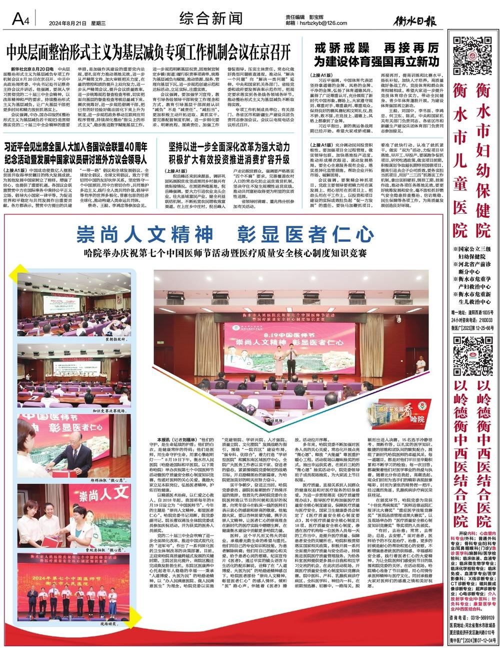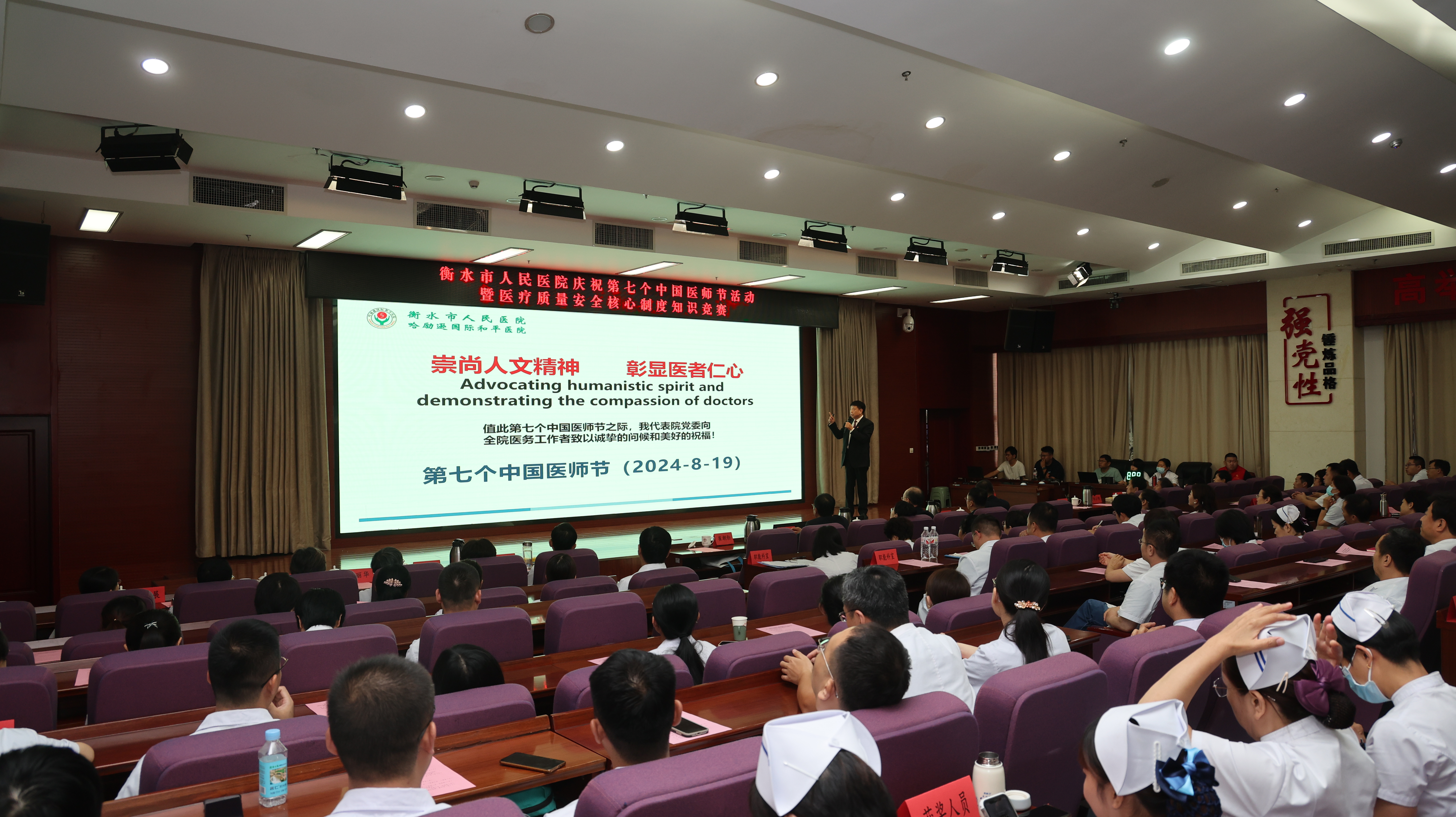 8月19日下午,衡水市人民醫院(哈勵遜國際和平醫院)舉辦慶祝醫師節暨醫療質量安全核心制度知識競賽活動,傳遞對醫師的關心關愛,激勵大家立足本職崗位,弘揚醫者精神,護佑百姓健康。