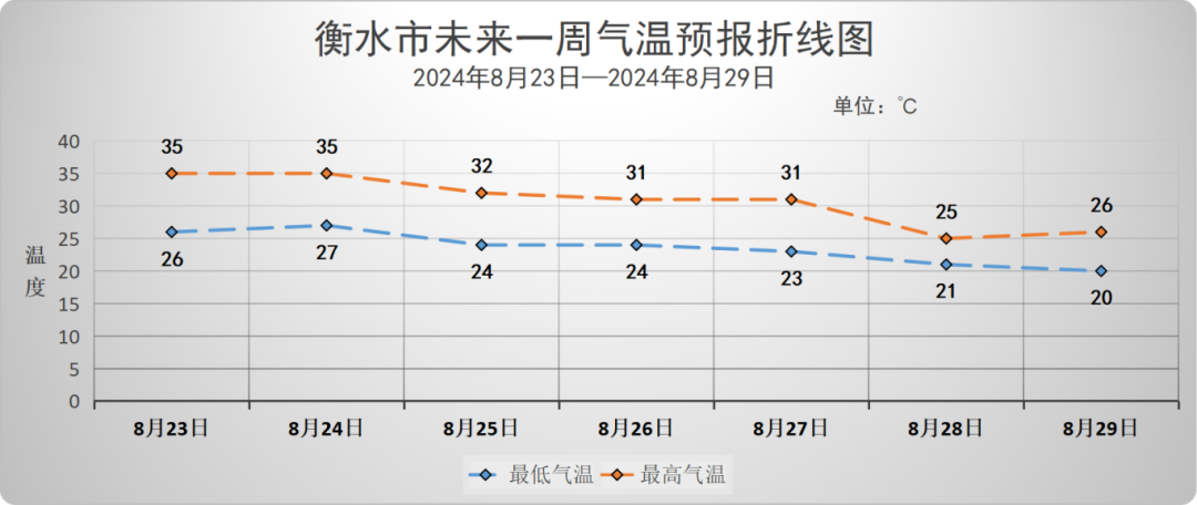 具體天氣預報為:8月23日,多云間晴,偏南風2~3級,氣溫:35到26℃;8月24日,多云轉陰有雷陣雨或陣雨,偏南風轉偏北風2~3級,氣溫:35到27℃;8月25日,多云間陰,東北風2~3級,氣溫:32到24℃;8月26日,多云,氣溫:31到24℃;8月27日,多云轉陰,有雷陣雨或陣雨,氣溫:31到23℃;8月28日,陰有雷陣雨或陣雨轉多云,氣溫:25到21℃;8月29日,多云,氣溫:26到20℃。