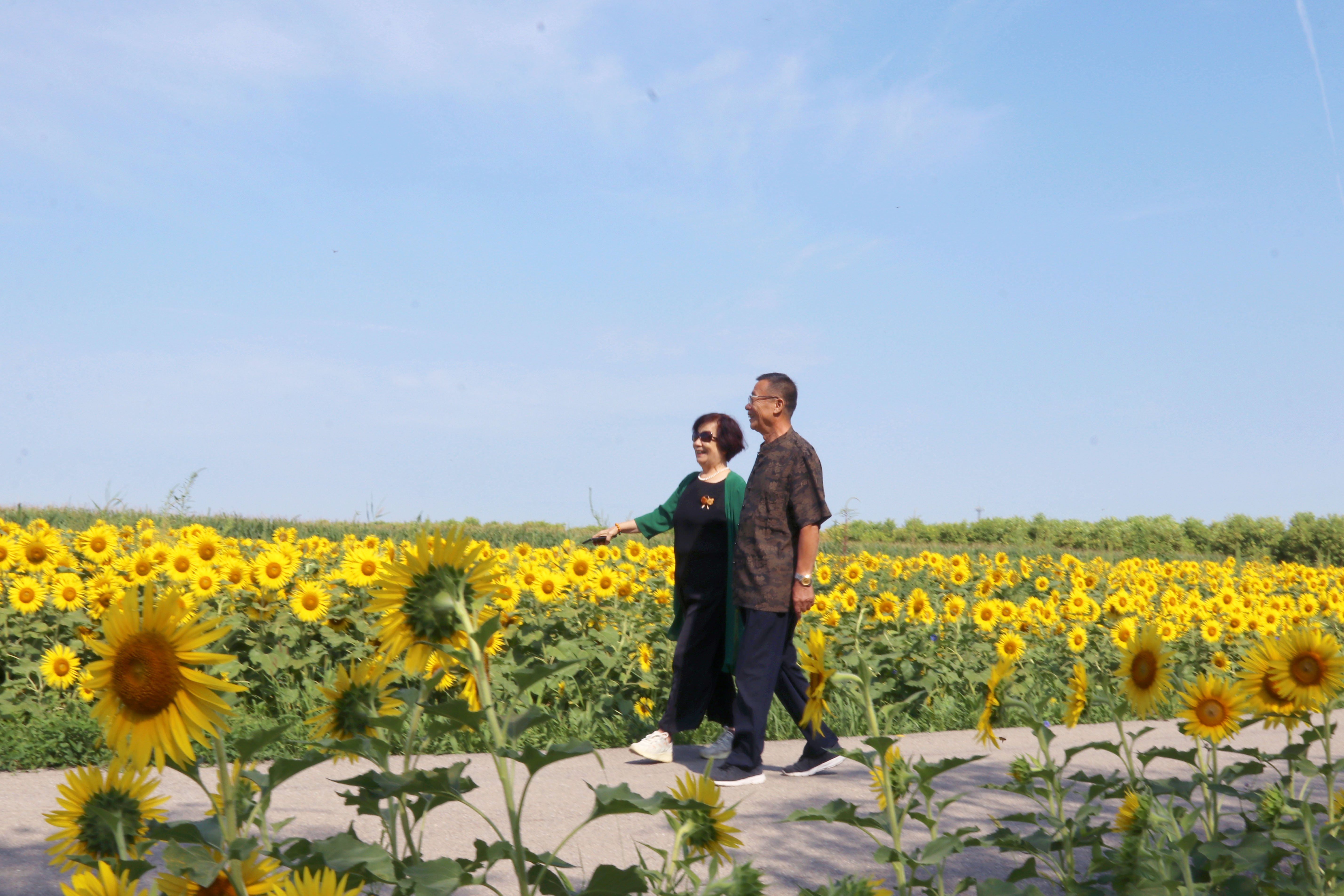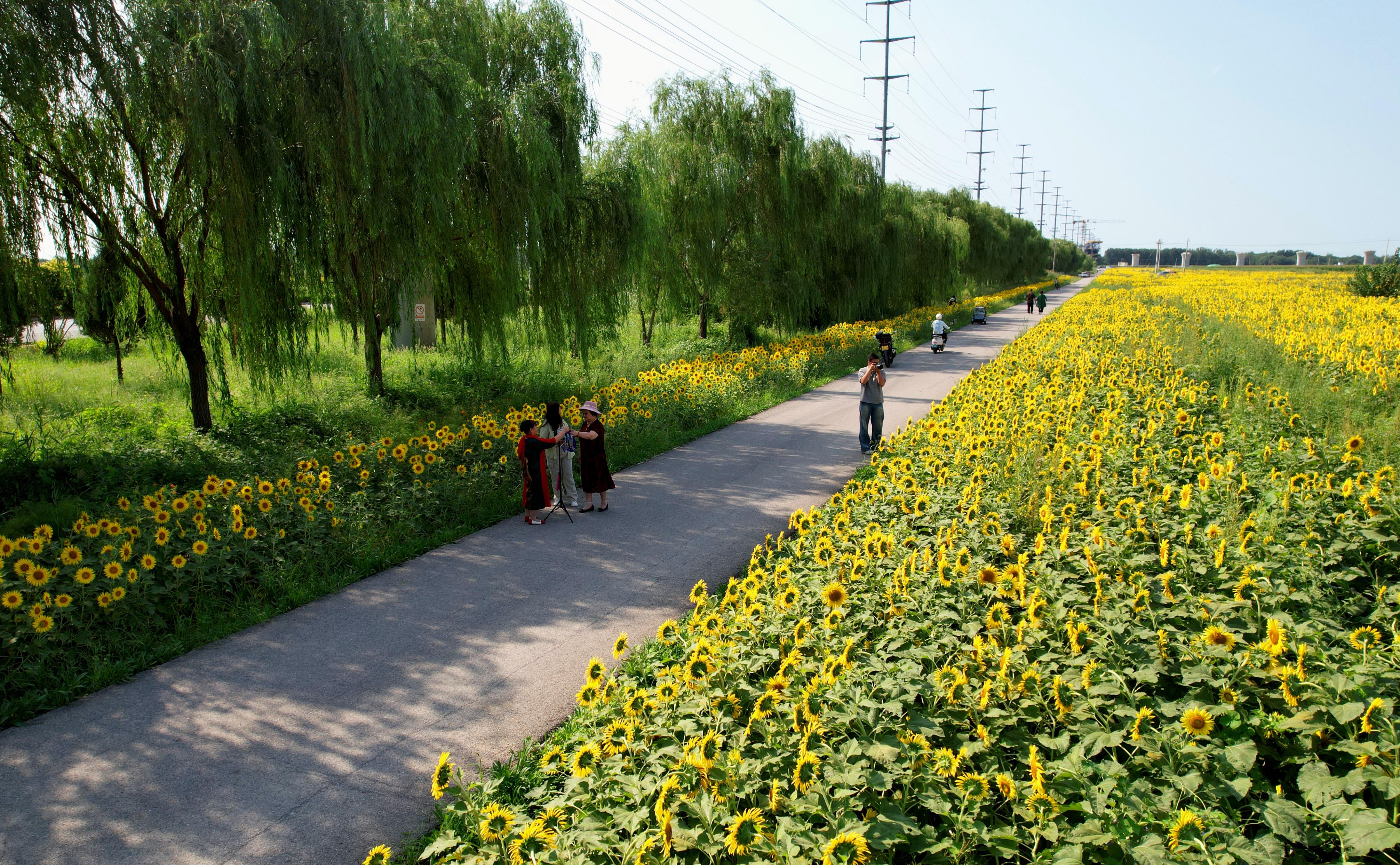 游客們被這美麗的田野風光所吸引,紛至沓來。有帶著專業相機和服裝道具來拍攝的游客,也有帶著手機支架前來直播和拍視頻的游客。他們漫步在花海中,盡情享受著大自然的美妙饋贈。有的靜靜地駐足欣賞,沉浸在向日葵的迷人美景中,仿佛和花海融為一體;有的則歡快地拍照留念,用鏡頭記錄下這難忘的瞬間。歡聲笑語在花海中回蕩,為這個初秋增添了一抹別樣的絢麗色彩。