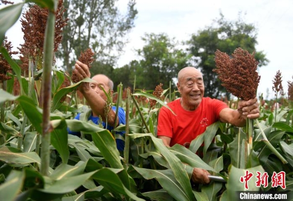 圖為村民展示收割的釀酒紅高粱穗。崔賢飛 攝