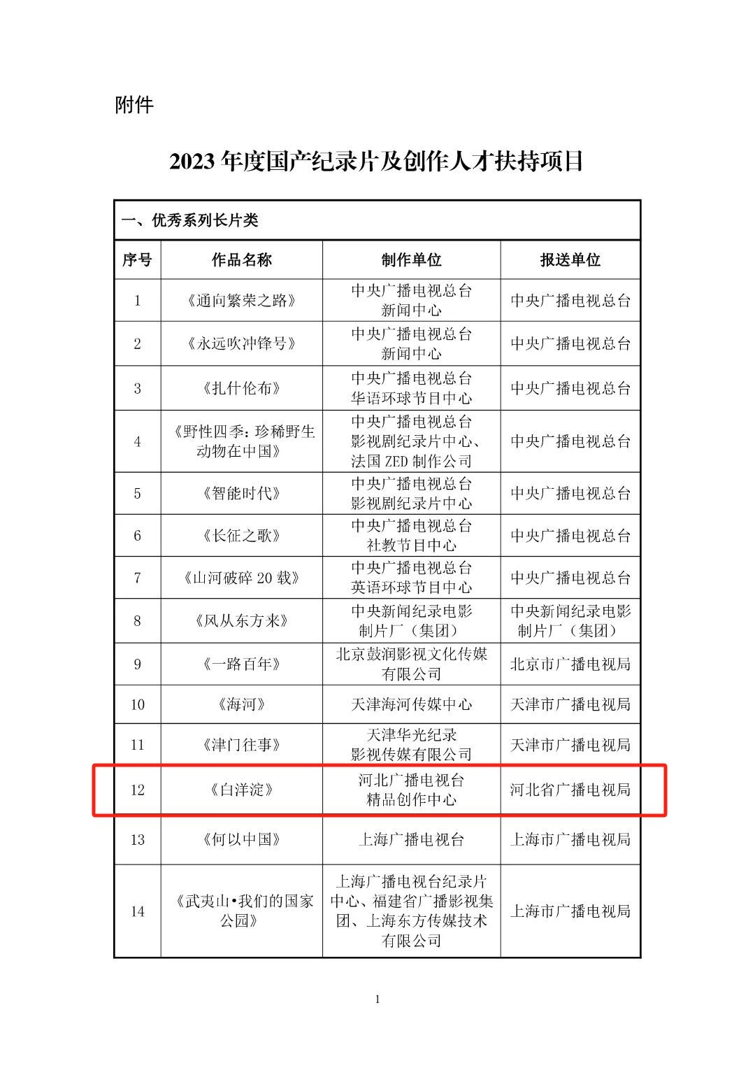9月10日,國家廣播電視總局公布了2023年度國產紀錄片及創作人才扶持項目評選結果,河北廣播電視臺創作的三集人文紀錄片《白洋淀》入選優秀系列長片類扶持項目,河北廣播電視臺入選優秀制作機構。