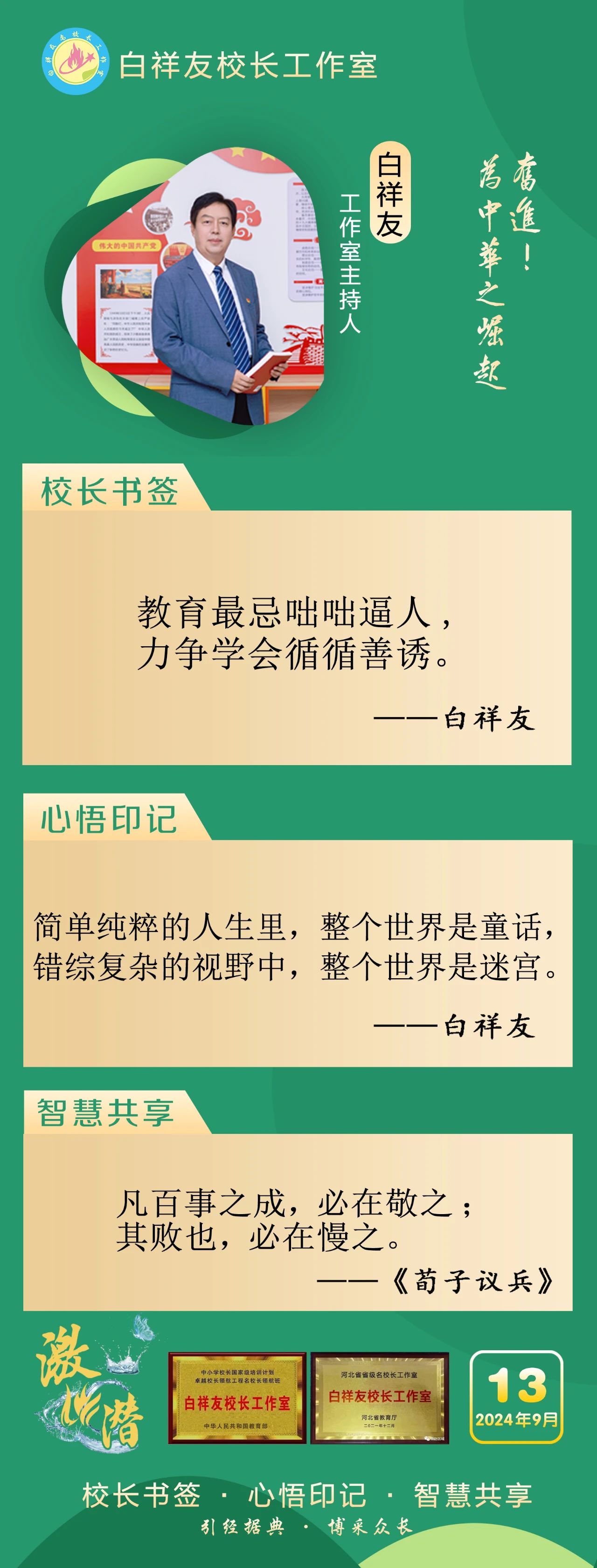 “白祥友校長工作室”成立于2019年4月,是教育部“國培計劃”中小學名校長領(lǐng)航工程、河北省首批名校長工作室,目前省內(nèi)外成員校24個。工作室堅持“資源共享、智慧共融、互助共贏”理念,已成為思想碰撞的交流場,資源共享的品牌站,成果展示的輻射源。