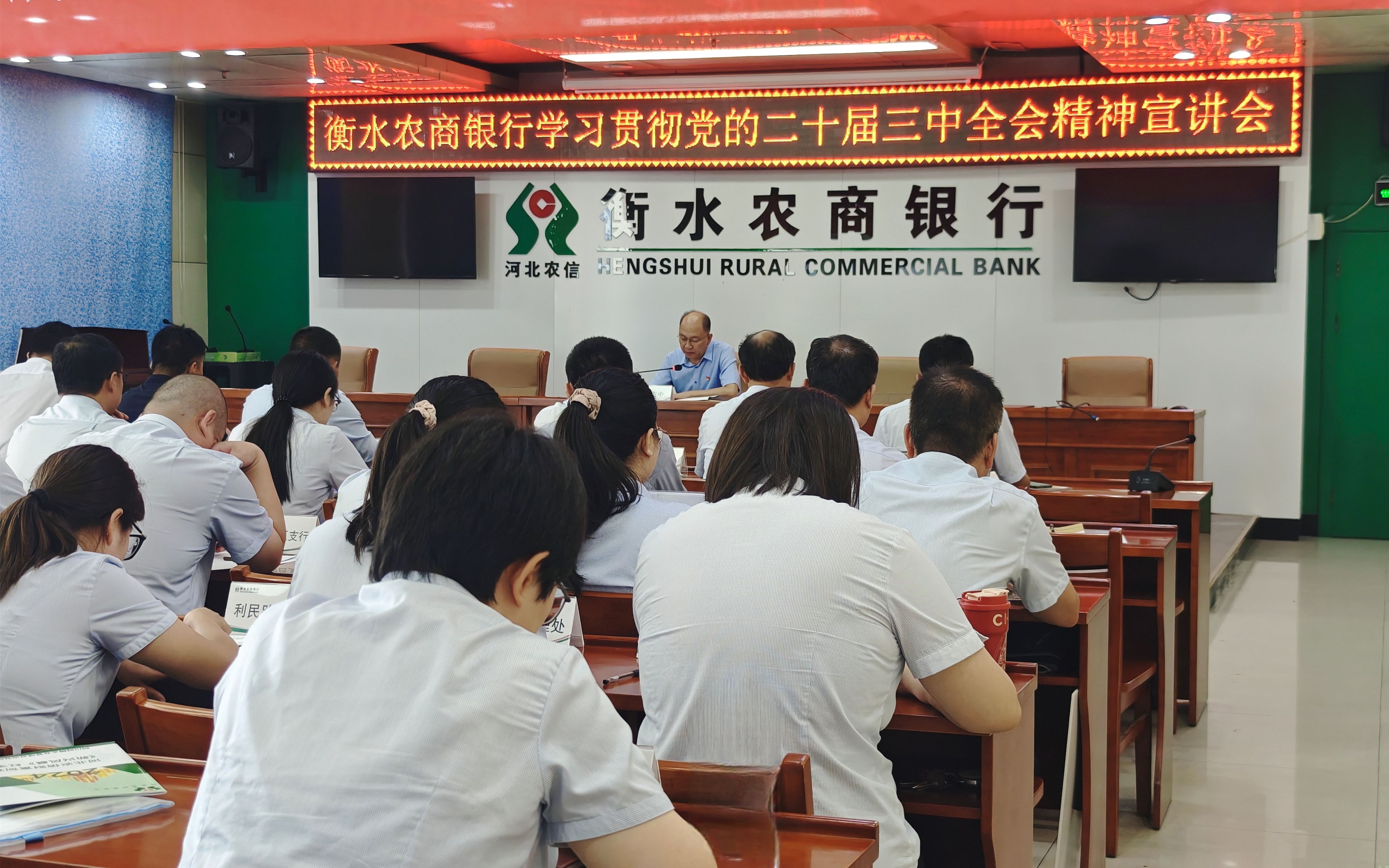 黨的二十屆三中全會召開以來,衡水農商銀行把學習宣傳貫徹黨的二十屆三中全會精神作為當前和今后一個時期的一項重大政治任務,組織全行深入學習領會全會精神,切實把思想和行動統一到習近平總書記重要講話和全會精神上來,全力以赴在金融服務經濟高質量、深化自身改革轉型、防范化解金融風險上取得新成效。