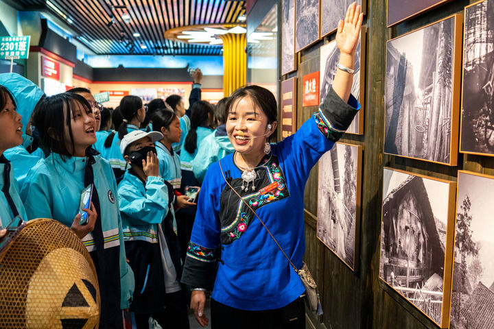 ??在湖南湘西十八洞村,講解員施艷琴為游客講解十八洞村的故事(2023年11月1日攝)。新華社記者 陳思汗 攝